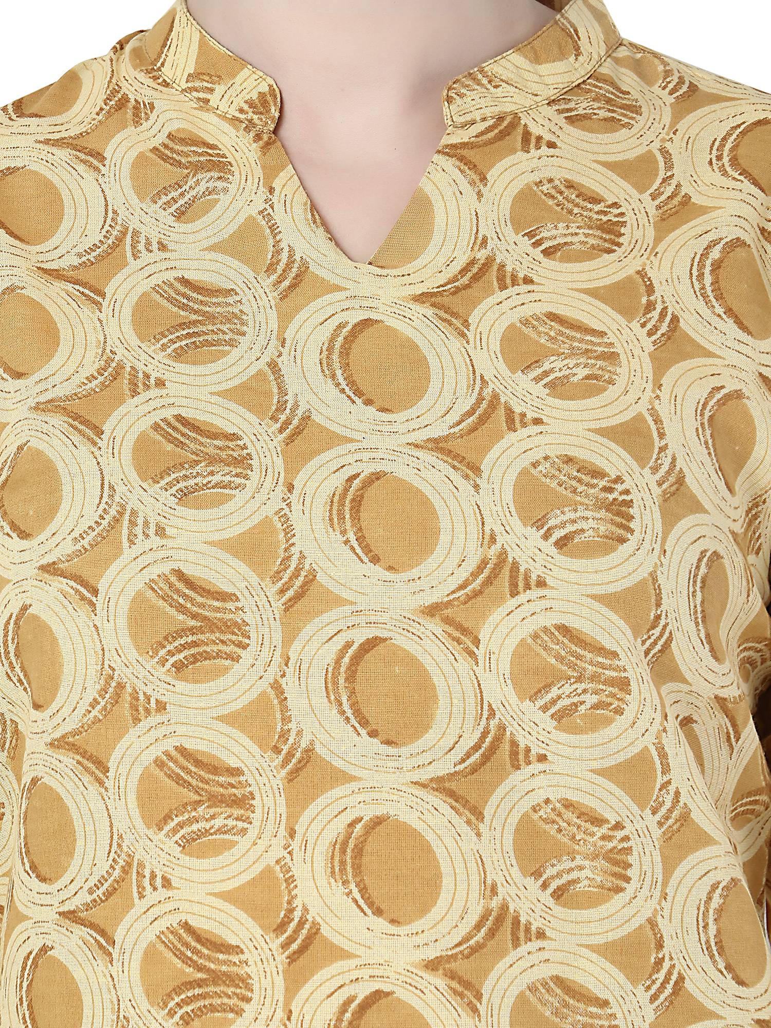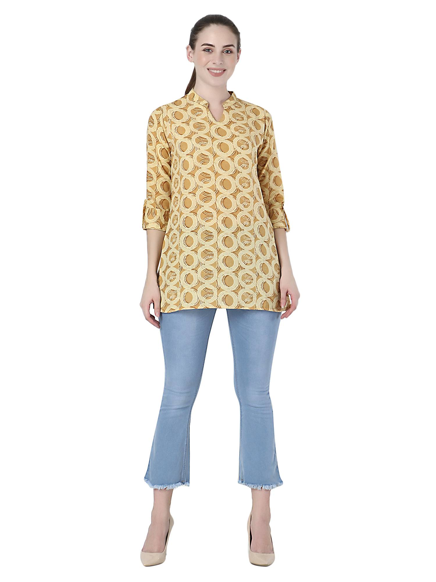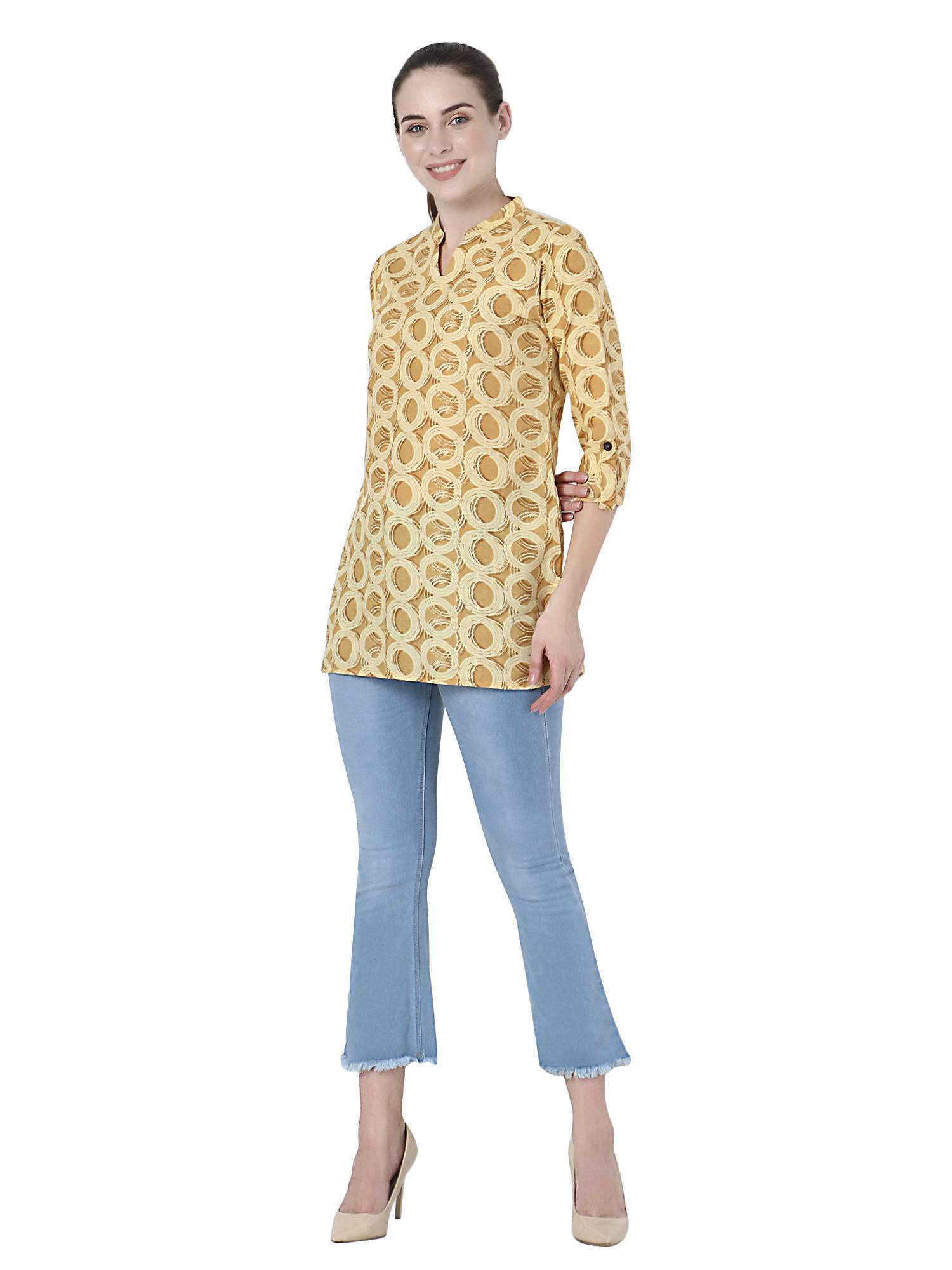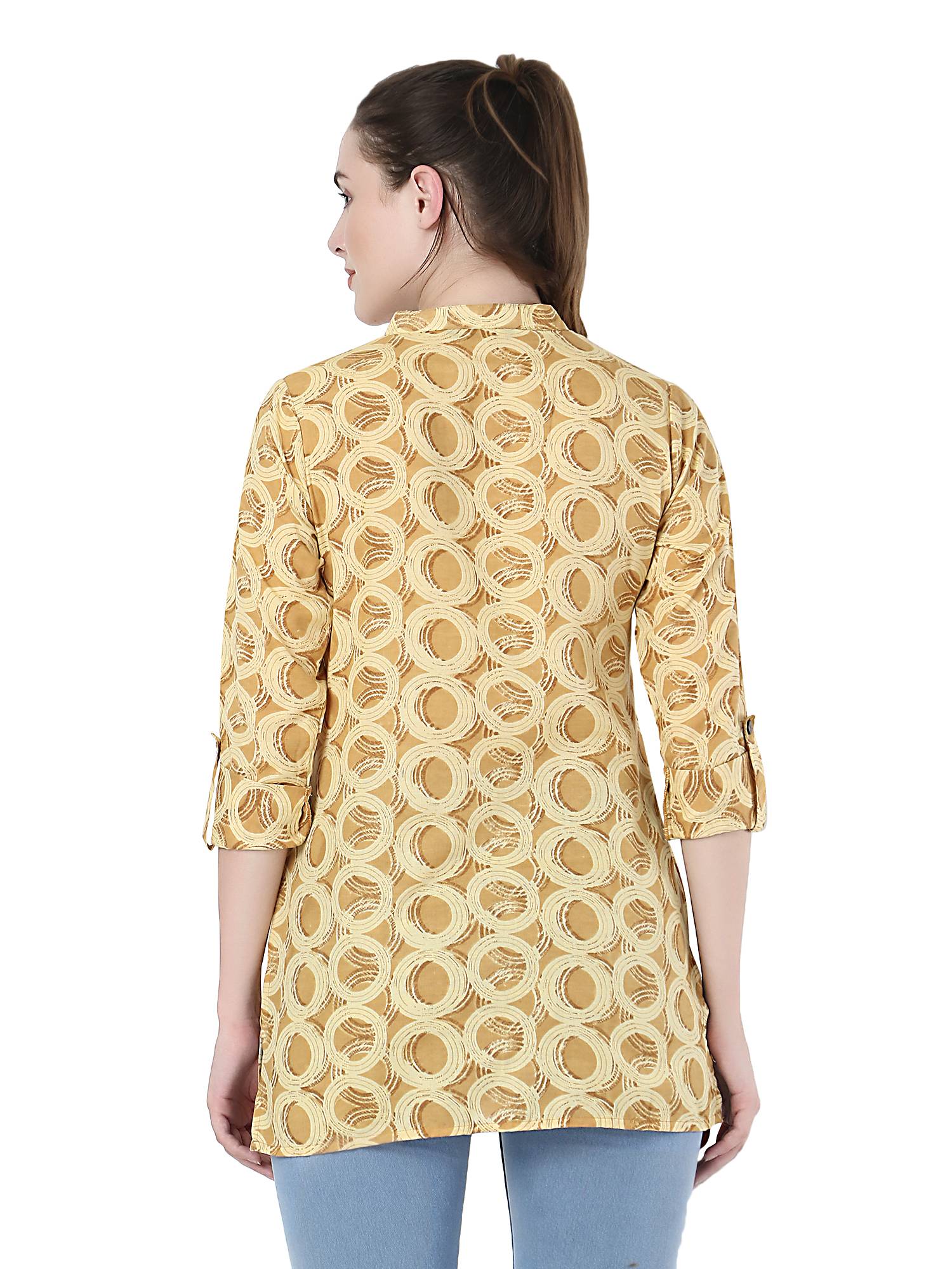 A stunning addition to your ethnic wardrobe, this printed short kurti comes with a Chinese collared neck, three-quarter sleeves with folded look and loop & side open slits for easy movement. Abstract prints on soft & breathable cotton fabrics make sure that you are at ease whole day. Ideal for casual or formal wear, this kurti makes sure you make impact everywhere.