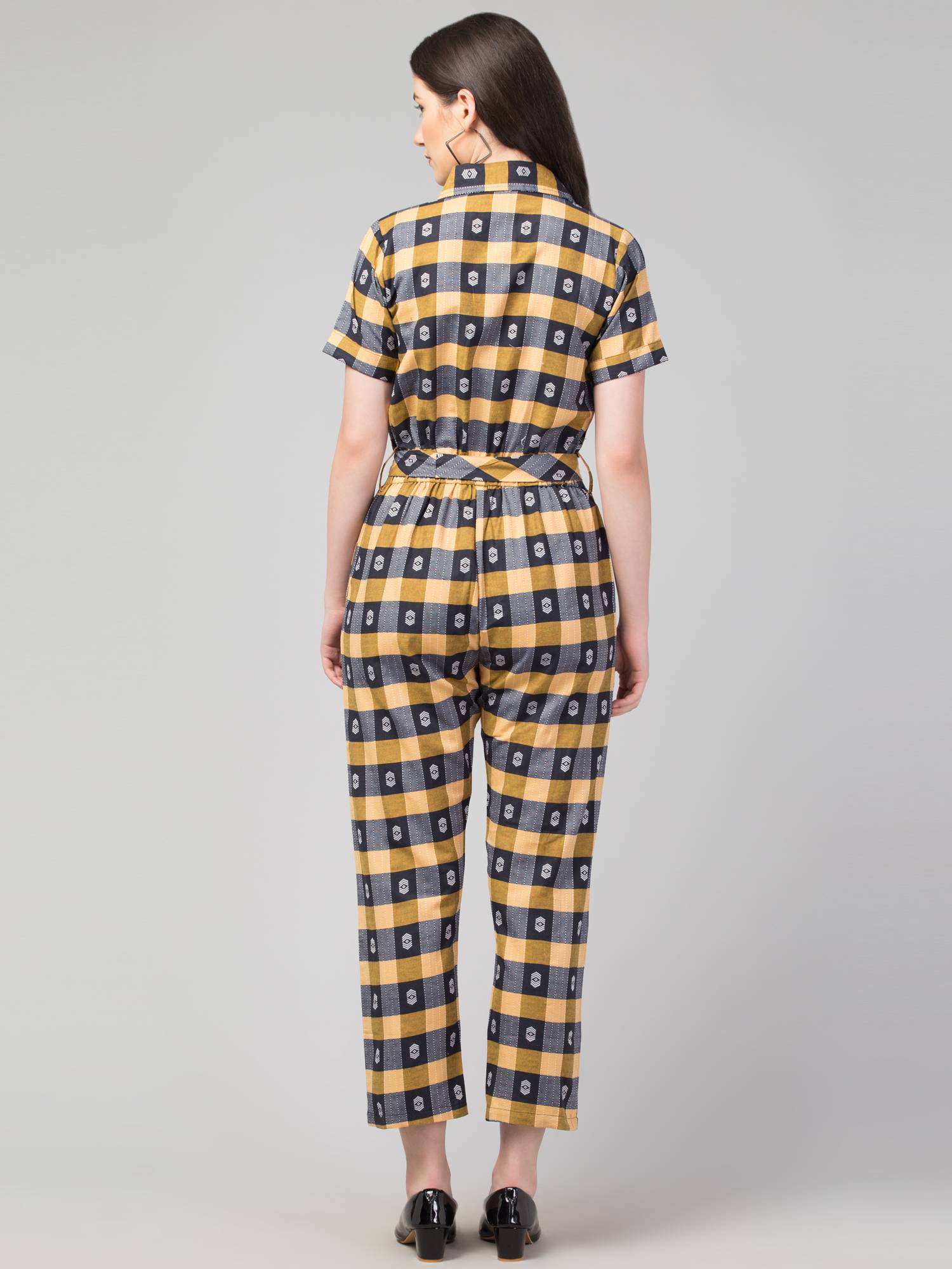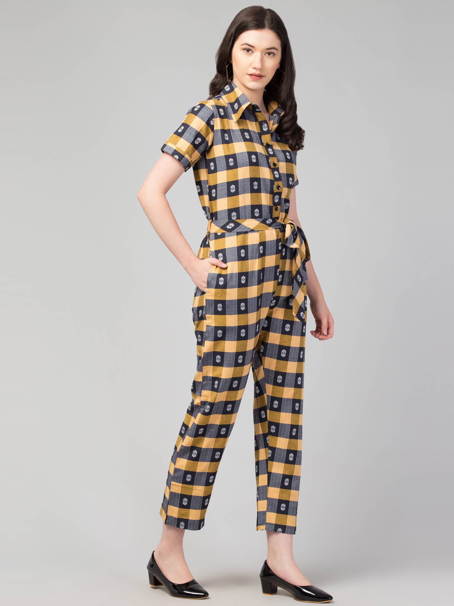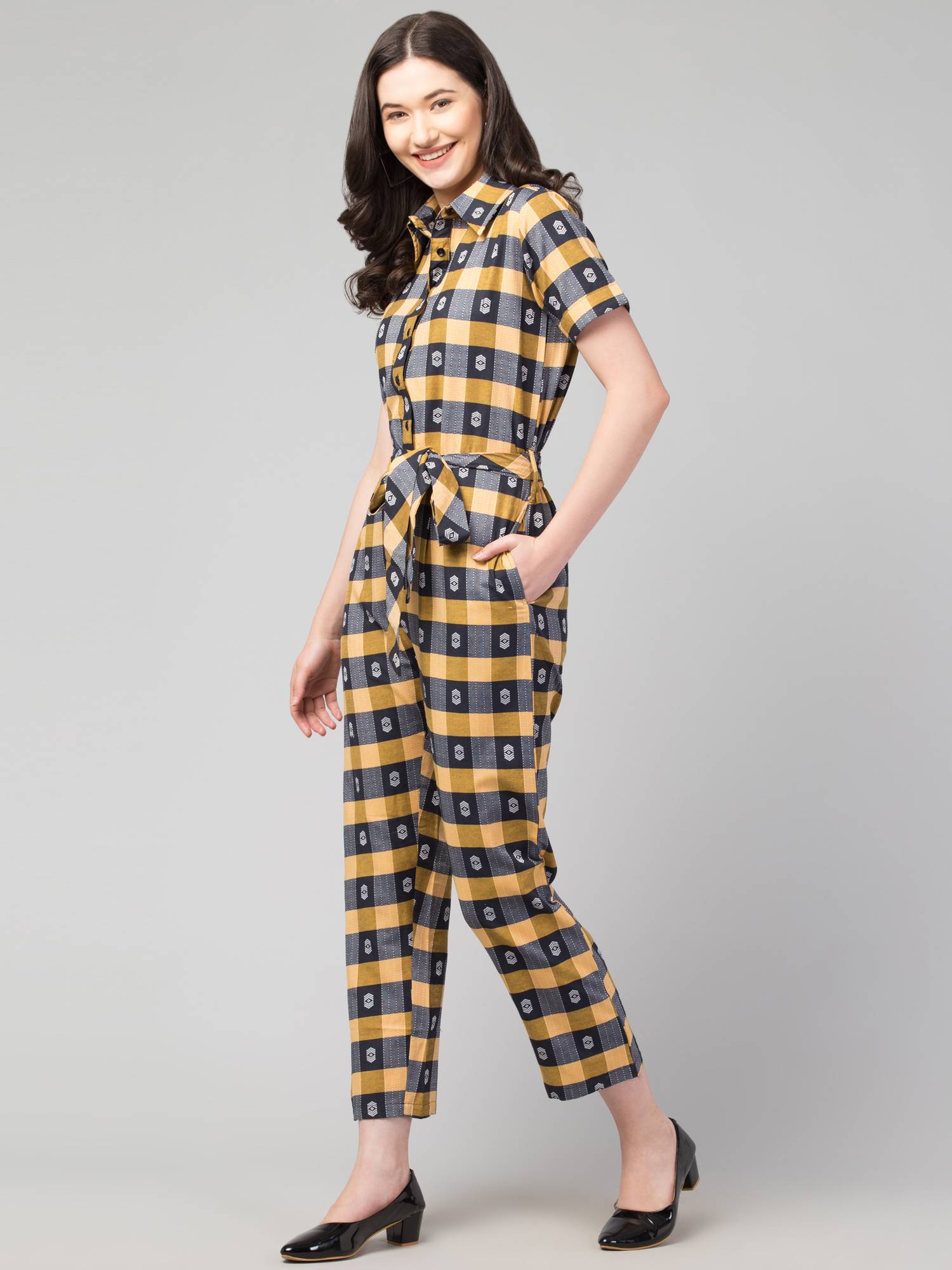 Collared Half Sleeved Cotton Jumpsuit. (Honey)