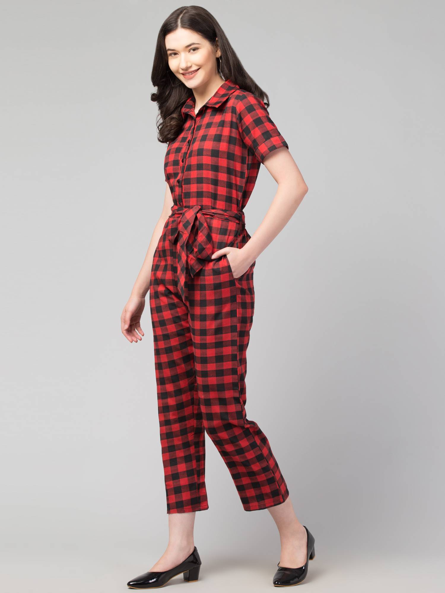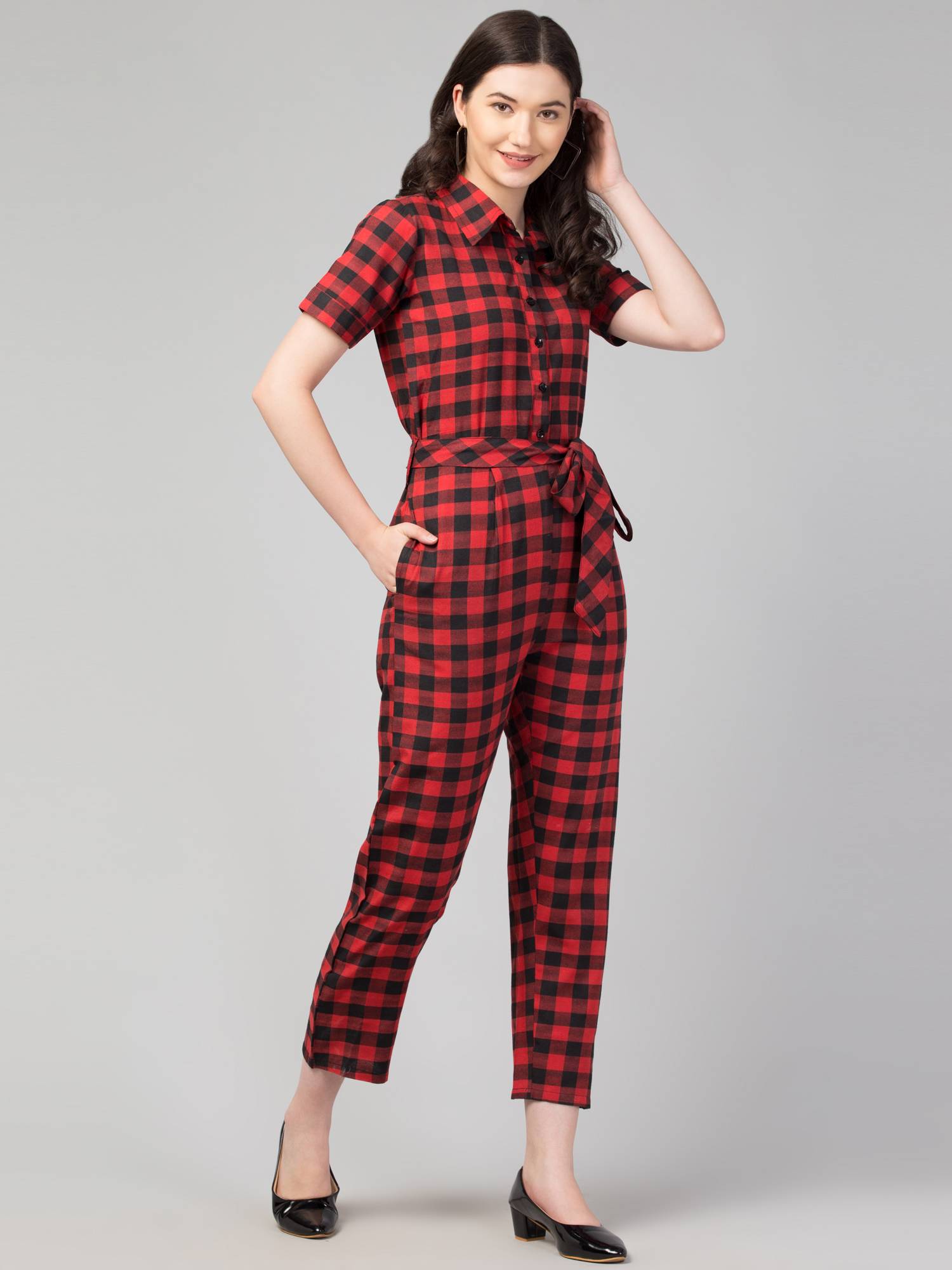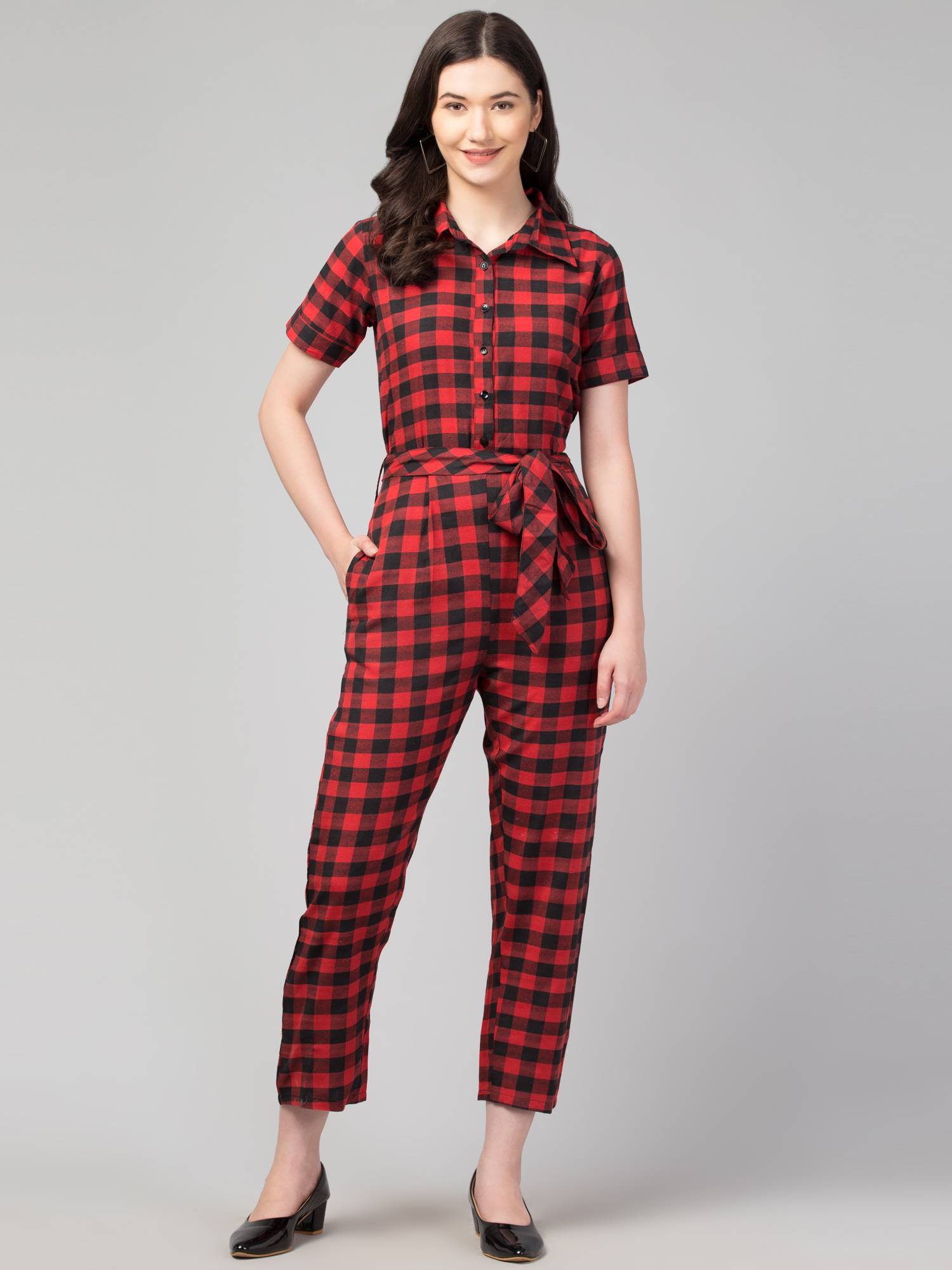 Introducing our stylish and versatile women's jumpsuits - the perfect addition to any wardrobe! Crafted from soft and comfortable cotton handloom fabrics, these jumpsuits feature a flattering shirt-style design with a collared, half-sleeved silhouette and a convenient button closure. The elasticated back ensures effortless wearing, while the separate fabric belt with loops adds a touch of flair and allows for a perfect, customized fit. With two side pockets for added practicality, these jumpsuits effortlessly transition from office wear to casual outings with friends. Available in a range of eye-catching colors and patterns, including checks and stripes, our jumpsuits are the epitome of chic and comfort for any occasion.