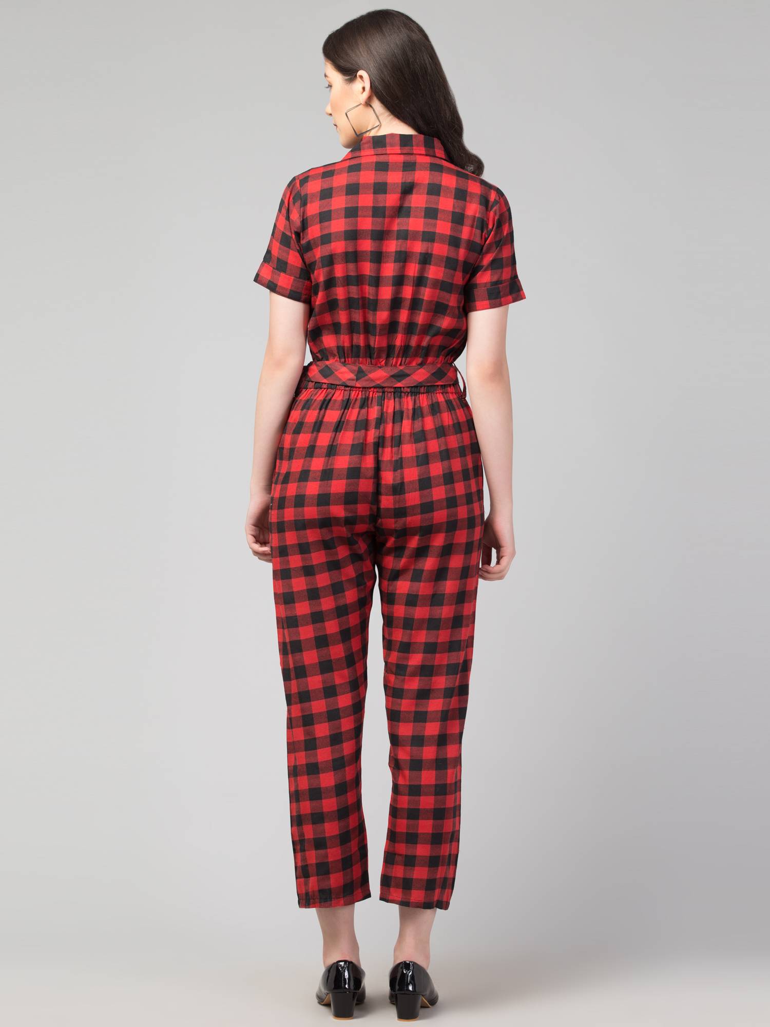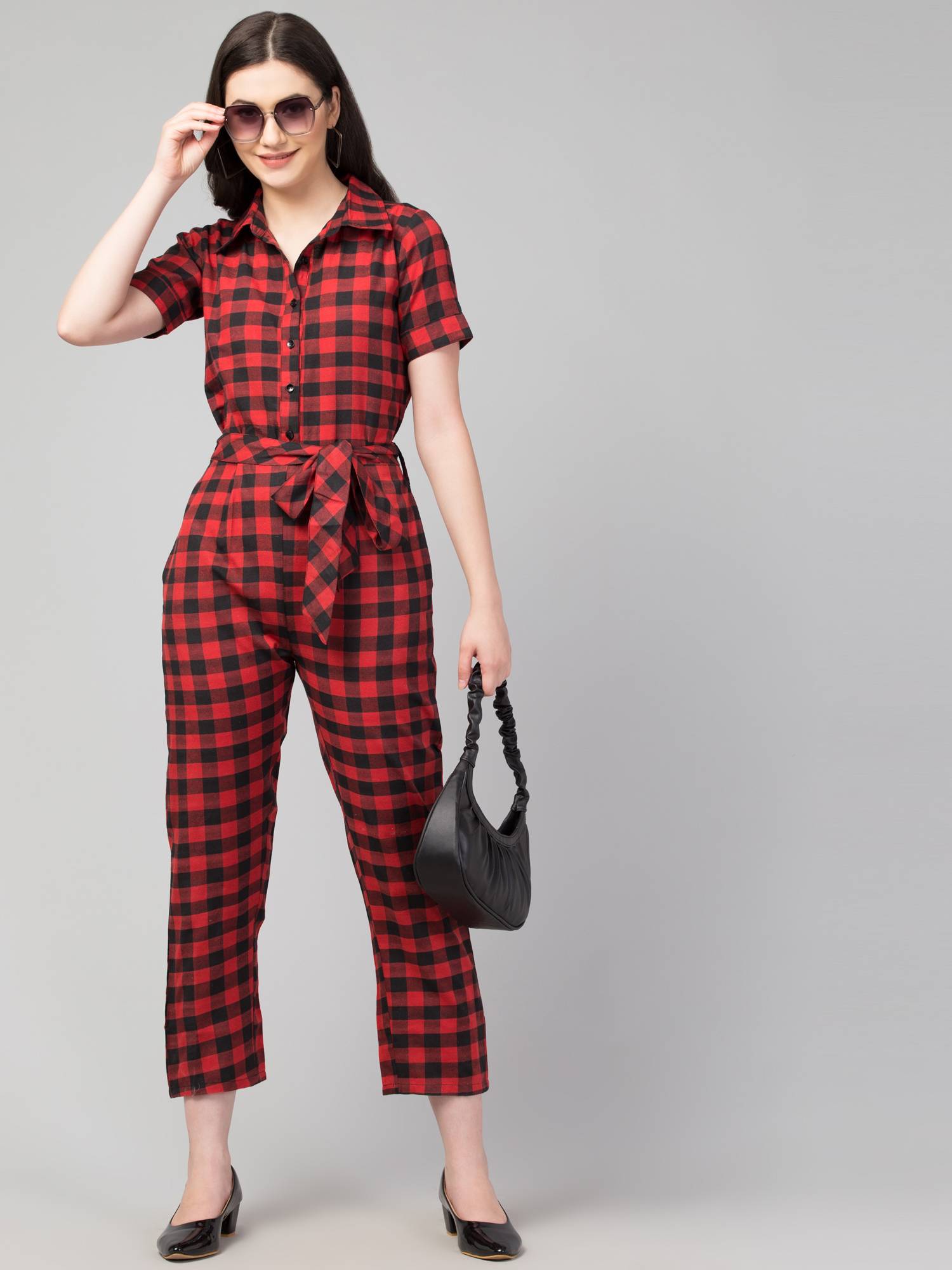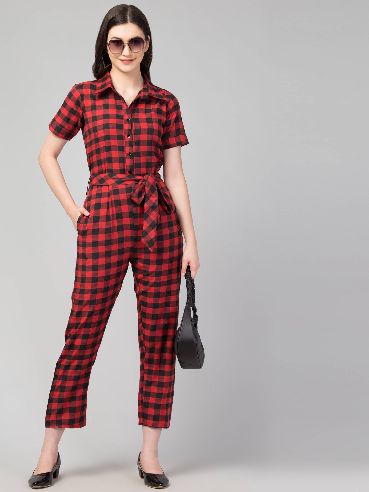 Introducing our stylish and versatile women's jumpsuits - the perfect addition to any wardrobe! Crafted from soft and comfortable cotton handloom fabrics, these jumpsuits feature a flattering shirt-style design with a collared, half-sleeved silhouette and a convenient button closure. The elasticated back ensures effortless wearing, while the separate fabric belt with loops adds a touch of flair and allows for a perfect, customized fit. With two side pockets for added practicality, these jumpsuits effortlessly transition from office wear to casual outings with friends. Available in a range of eye-catching colors and patterns, including checks and stripes, our jumpsuits are the epitome of chic and comfort for any occasion.