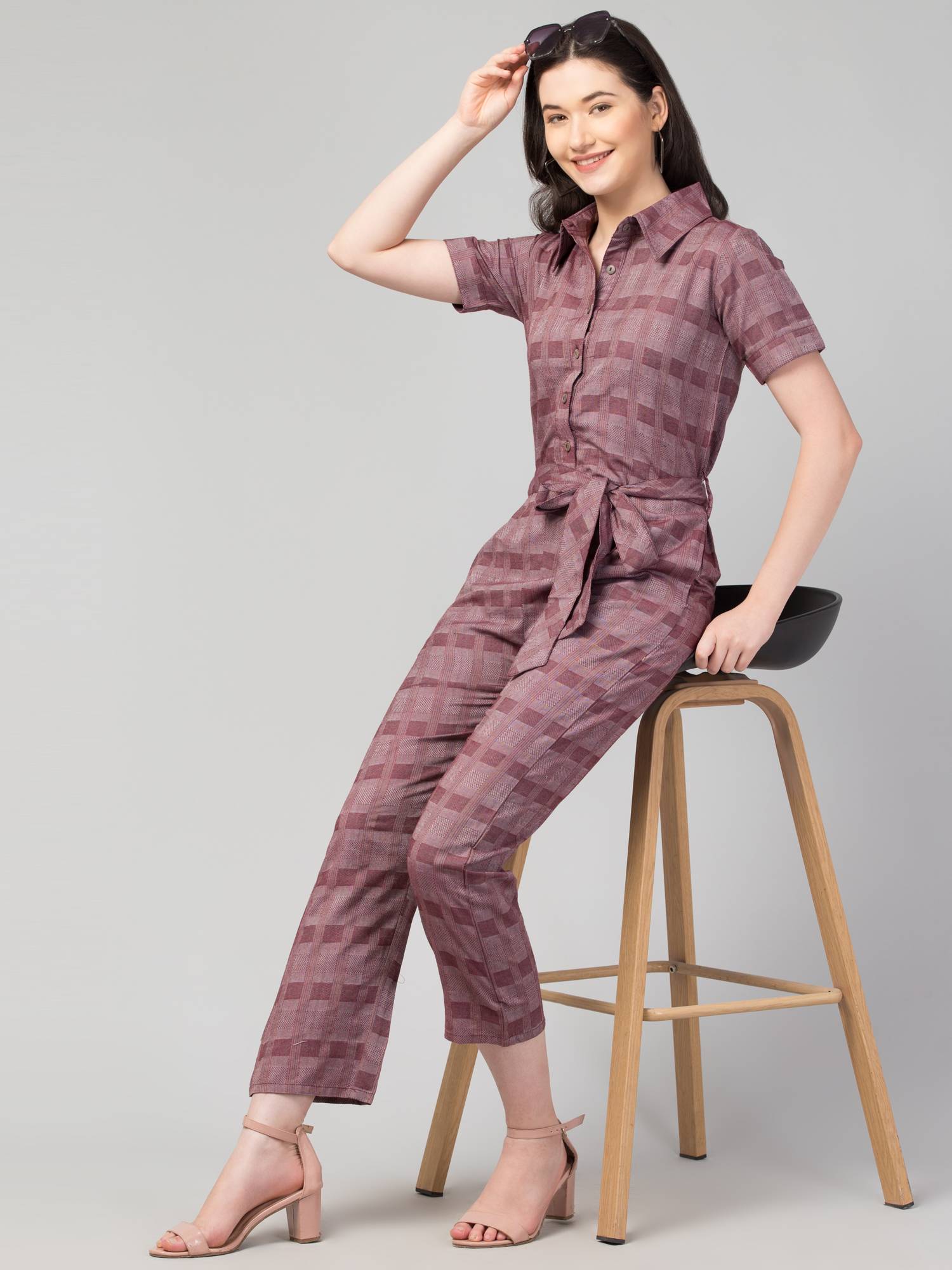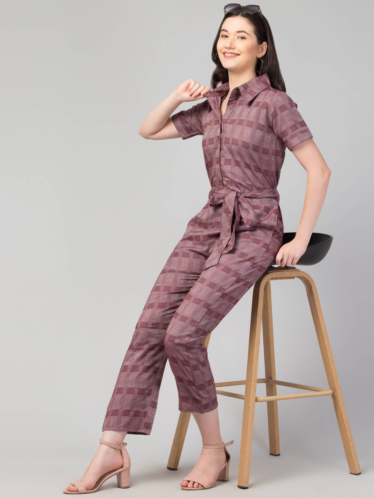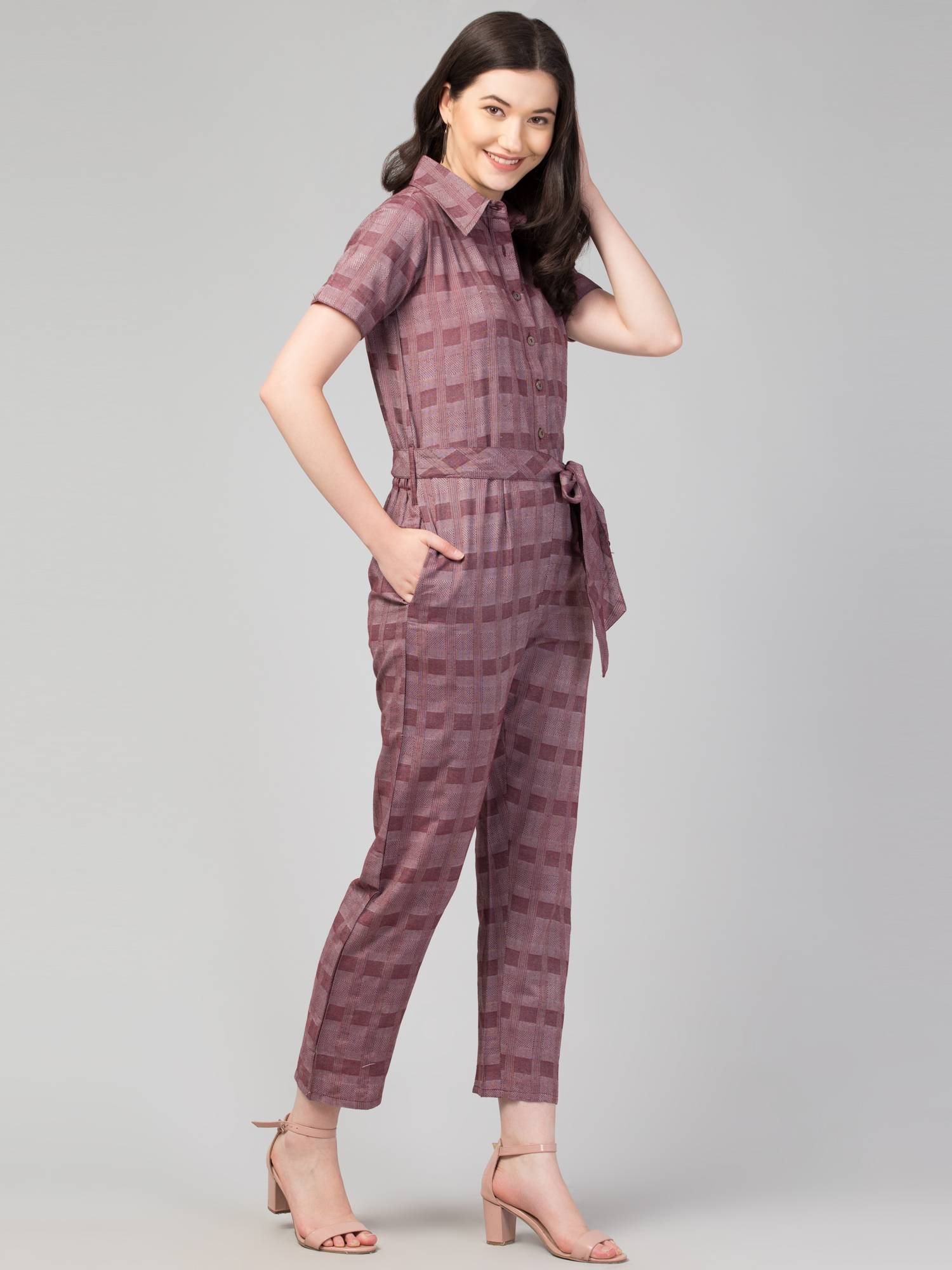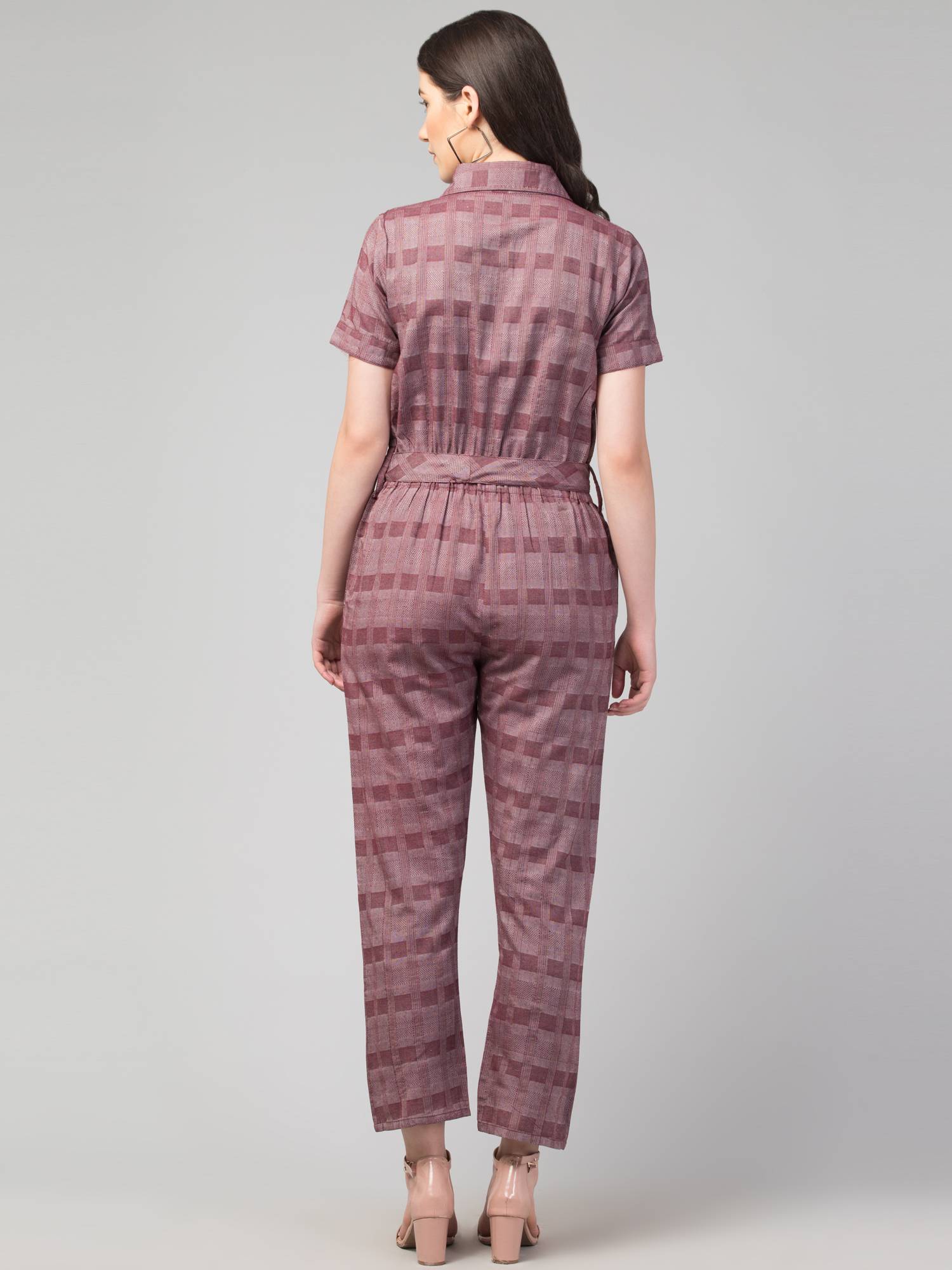 Collared Half Sleeved Cotton Jumpsuit. (Wine)