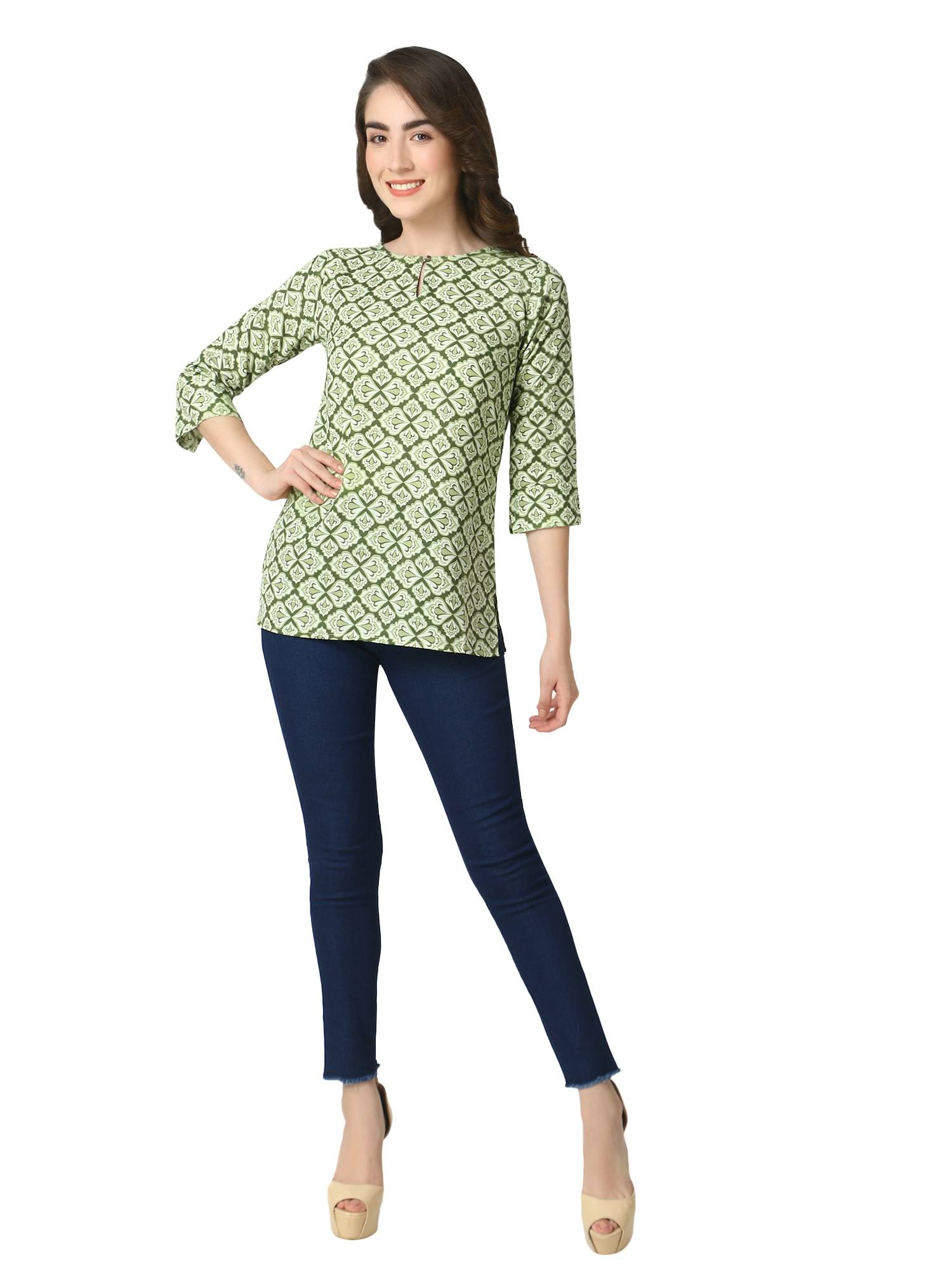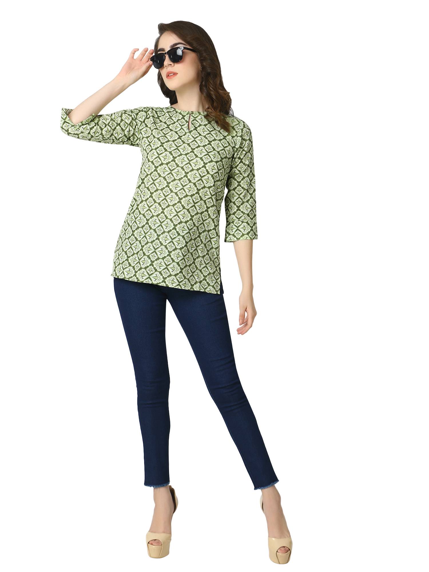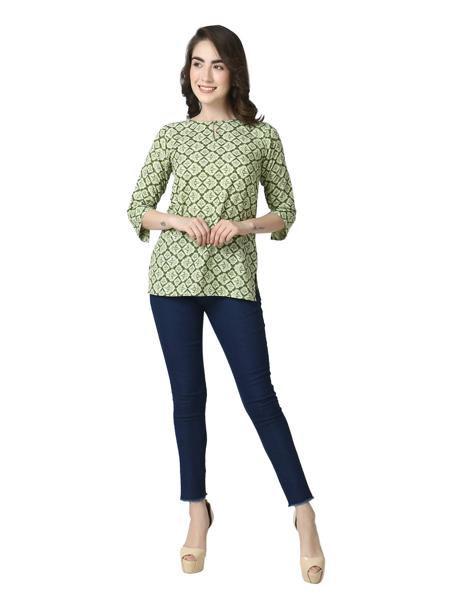 Cotton Short Printed Kurti For Jeans. (Green)