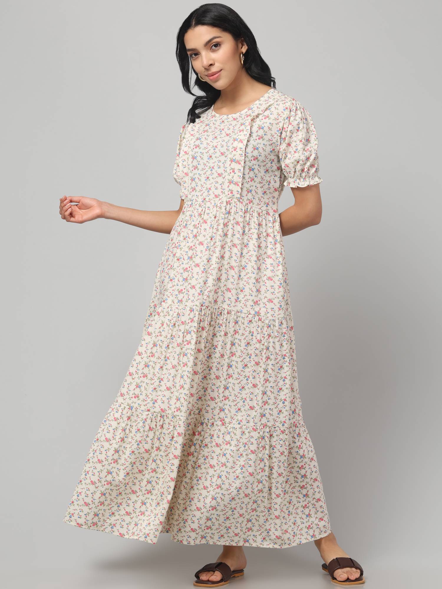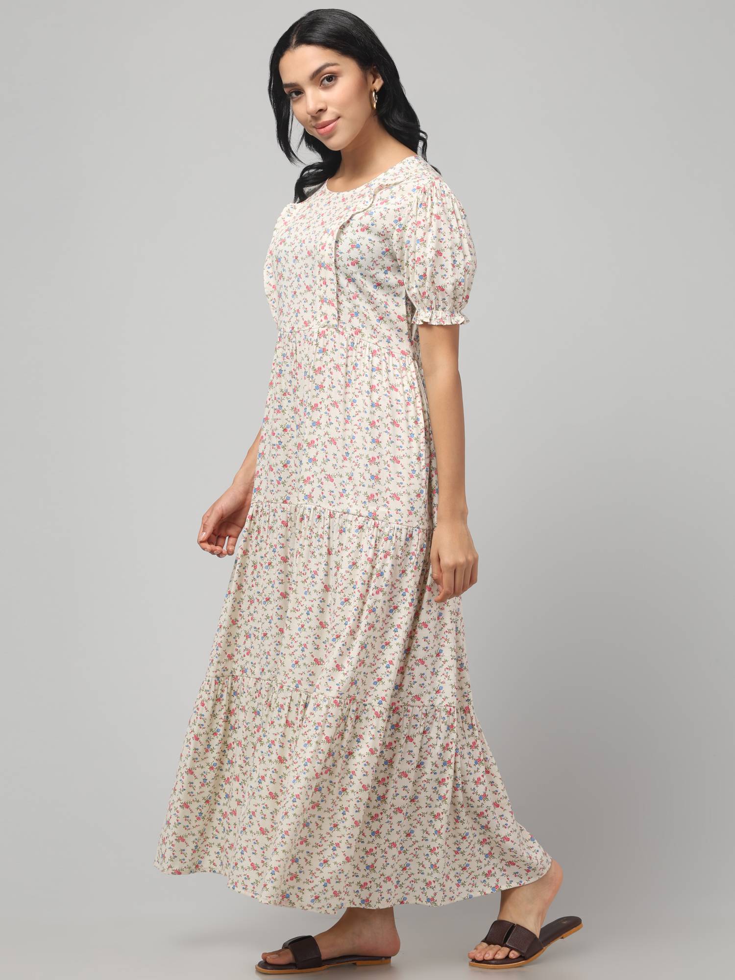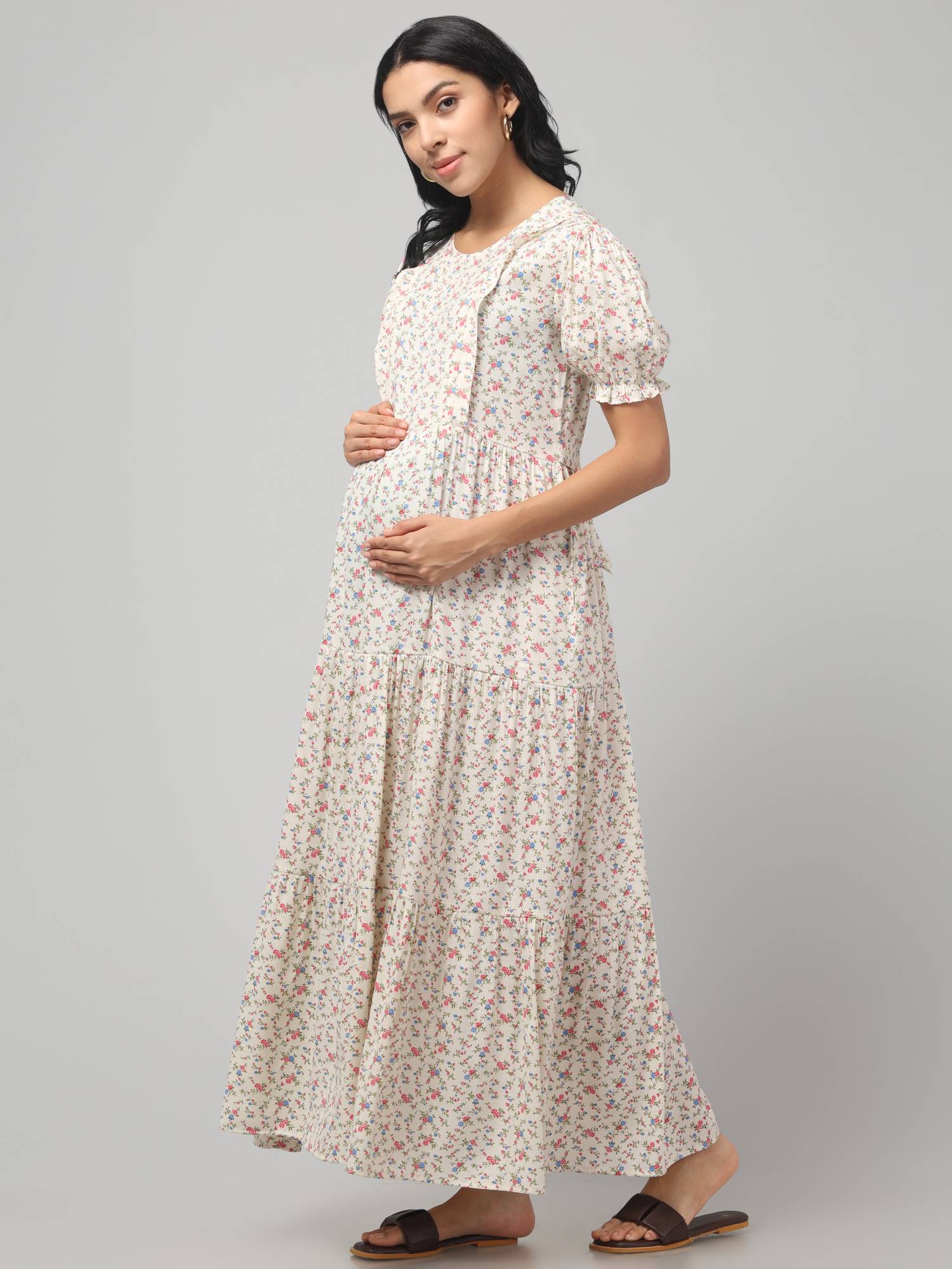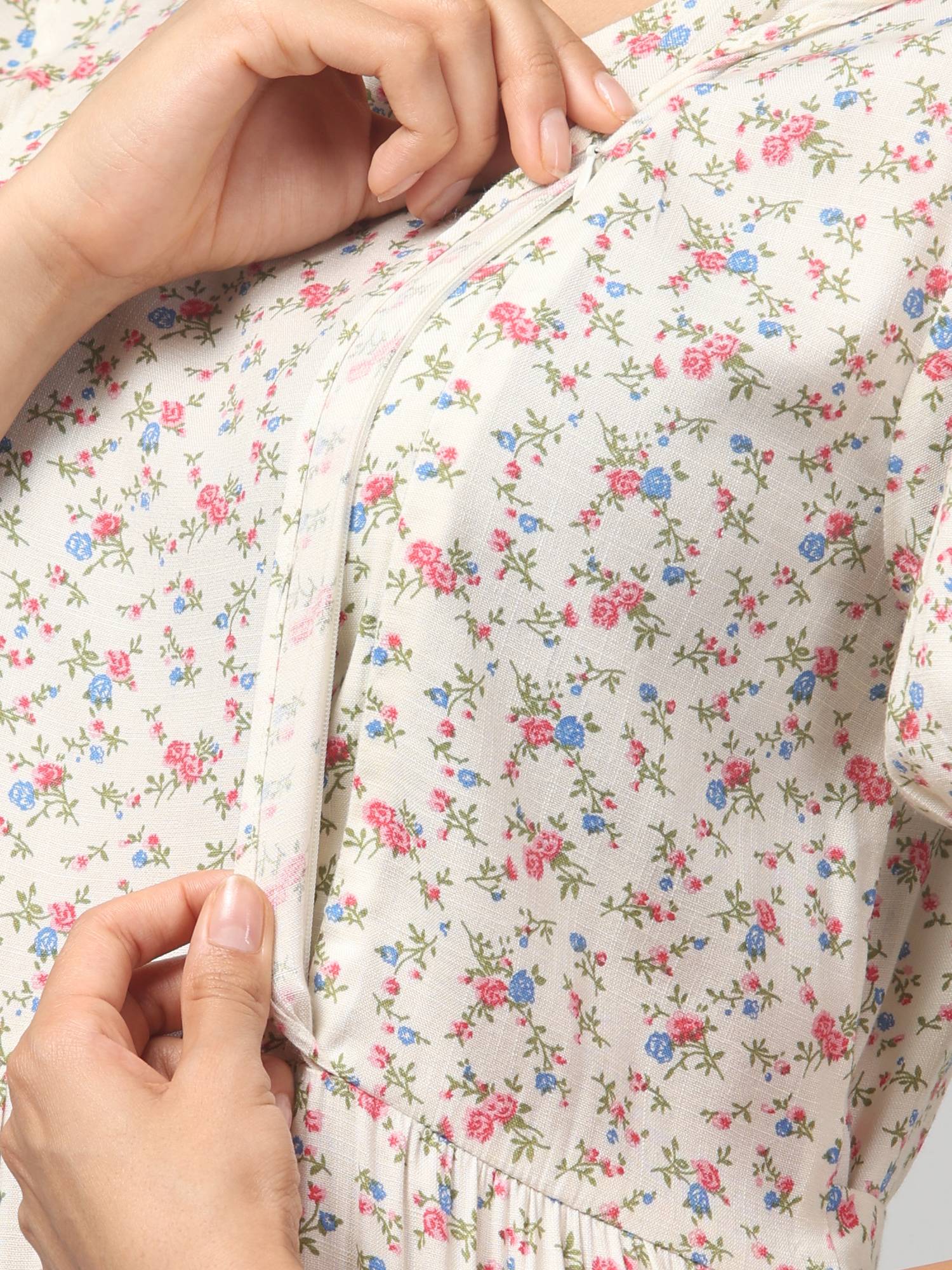 Experience comfort and style throughout your pregnancy and beyond with our Maternity Feeding Dress, featuring dual 9-inch zippers on both sides elegantly hidden under front plackets for easy and discreet breastfeeding, complemented by an inside covered flap for privacy. Designed with a flattering round neck, trendy puffed sleeves, and an attached adjustable belt, this dress shapes perfectly to your body during and after pregnancy. Its beautifully flared hemline, created with added panels, gracefully conceals your baby bump while enhancing your silhouette. Practicality meets style with two side pockets to keep essentials close at hand, all crafted from super comfortable, breathable, and skin-friendly fabric. Available in a variety of the latest prints including floral and polka dots, and offered in sizes from S to 6XL, this maternity feeding dress ensures a perfect fit for every mom-to-be, keeping you fashionable, comfortable, and confident throughout your journey.