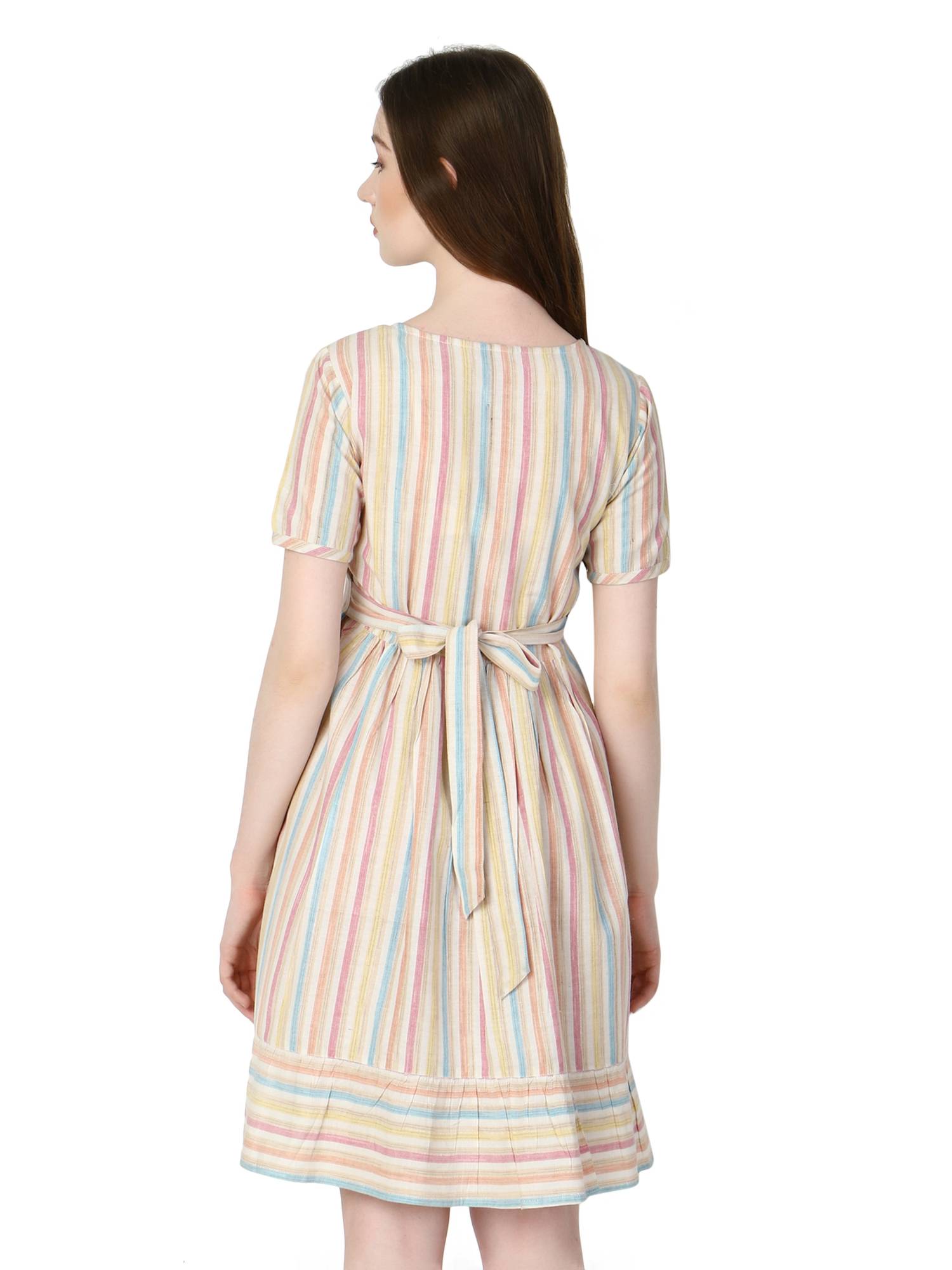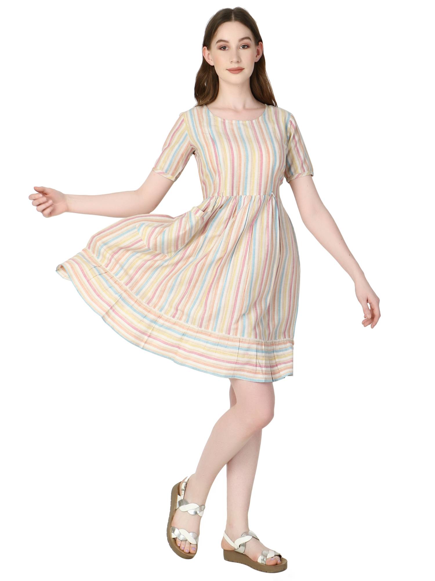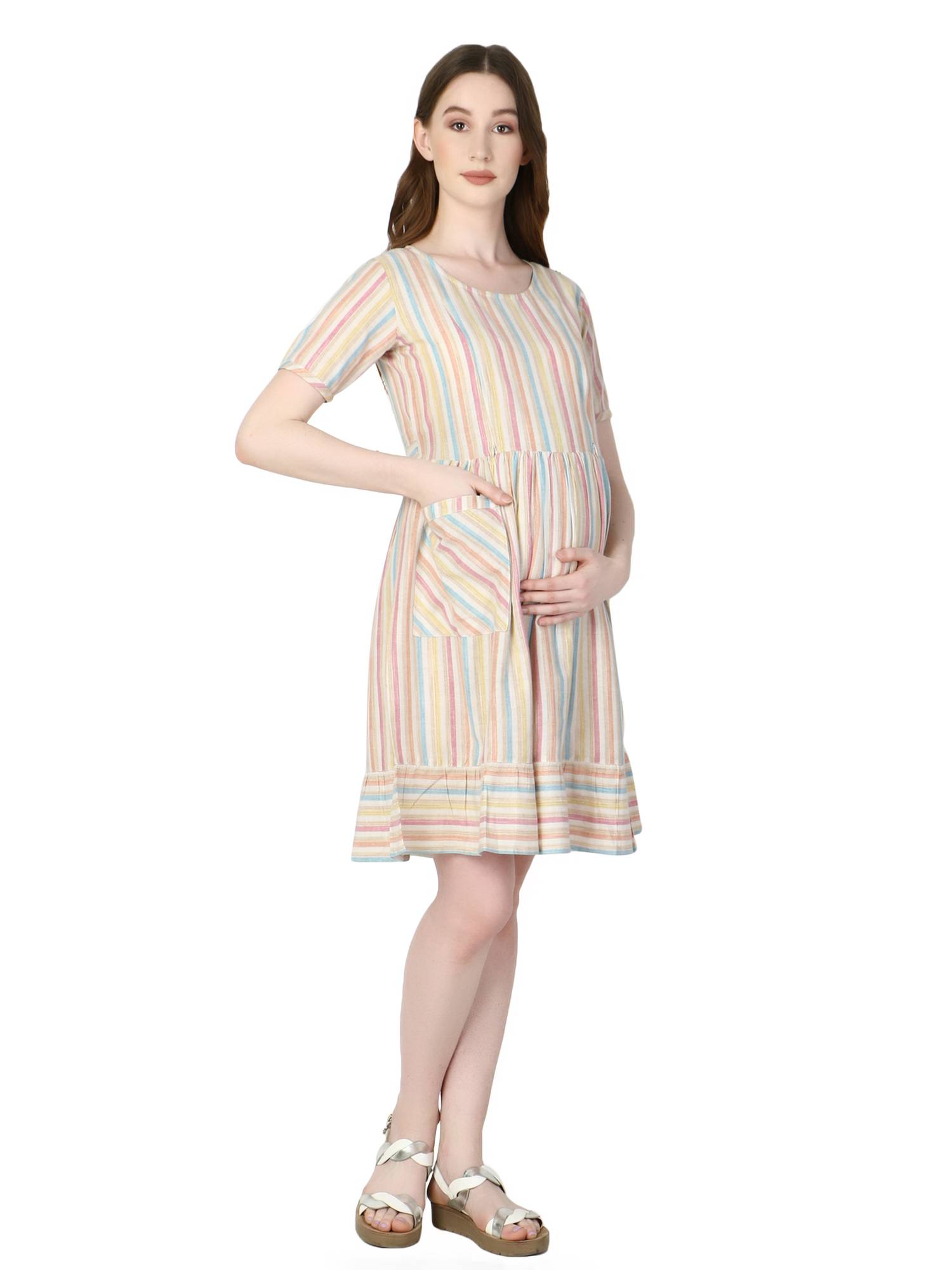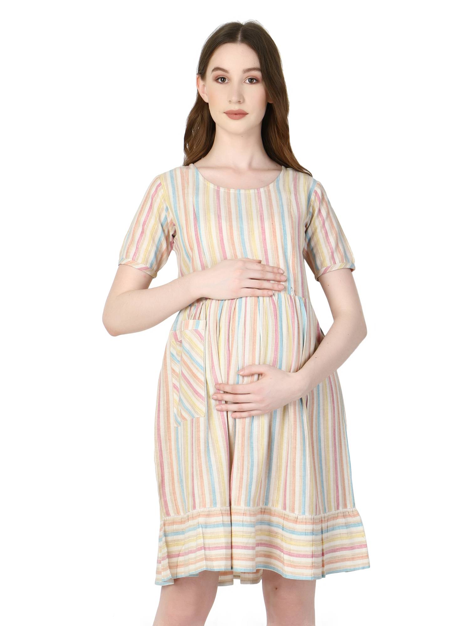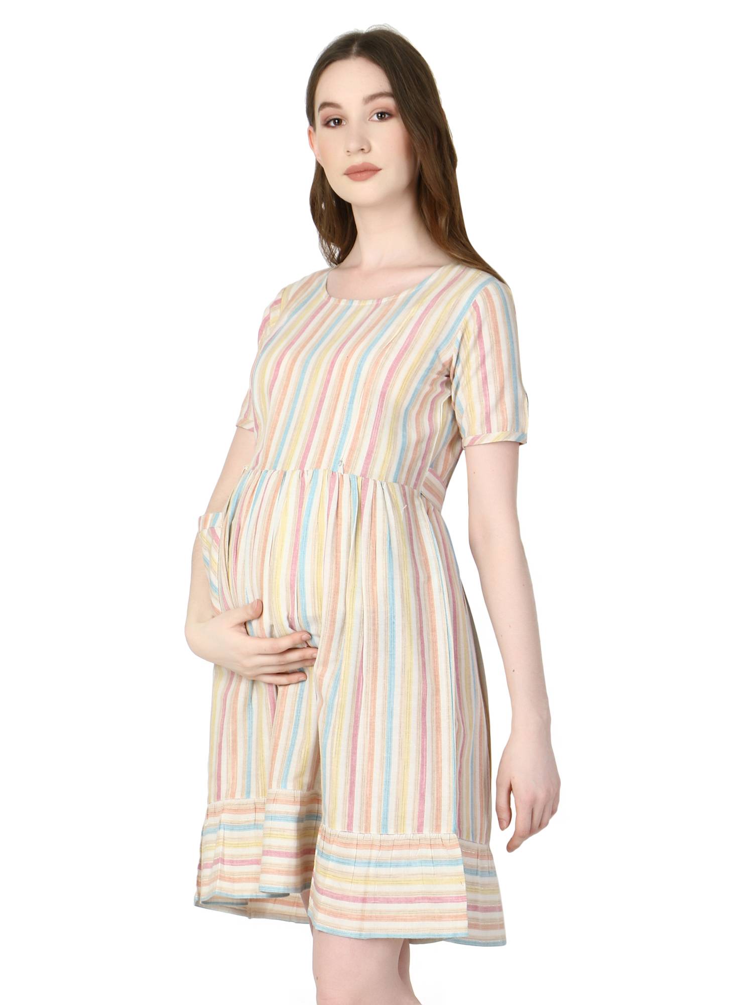 Who said maternity dresses for women can't be flattering? These stylish feeding dresses for women will make you feel more good about your pregnancy. Pair this dress with leggings to suit your need of feeding kurtis for women. Concealed invisible vertical zippers on both sides proves very useful in nursing baby anywhere anytime with privacy. Latest collection launched keeping upcoming fashion and trends for mothers in mind. Colourful stripes to add charm in your wardrobe, comfortable and breathable cotton fabrics. Flared hemline with statement pocket will surely turns head when you style it for your everyday wear or lunch with friends. Ideal for office wear, casual wear, beach wear or any other occasion. Perfect dress for photoshoot to get your pics clicked like never before. Best gift for new mothers, baby shower or your loved ones to make them feel special.
