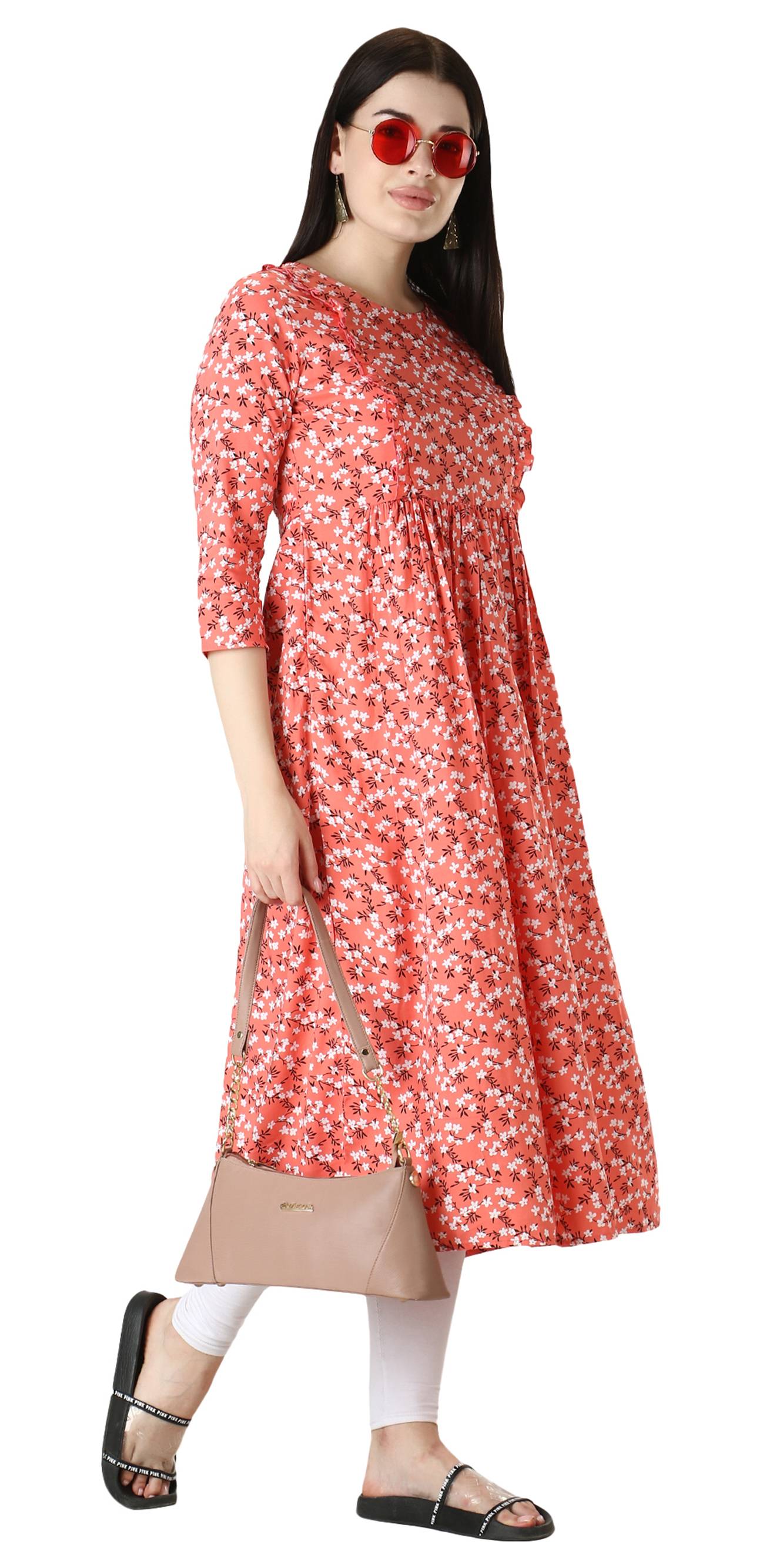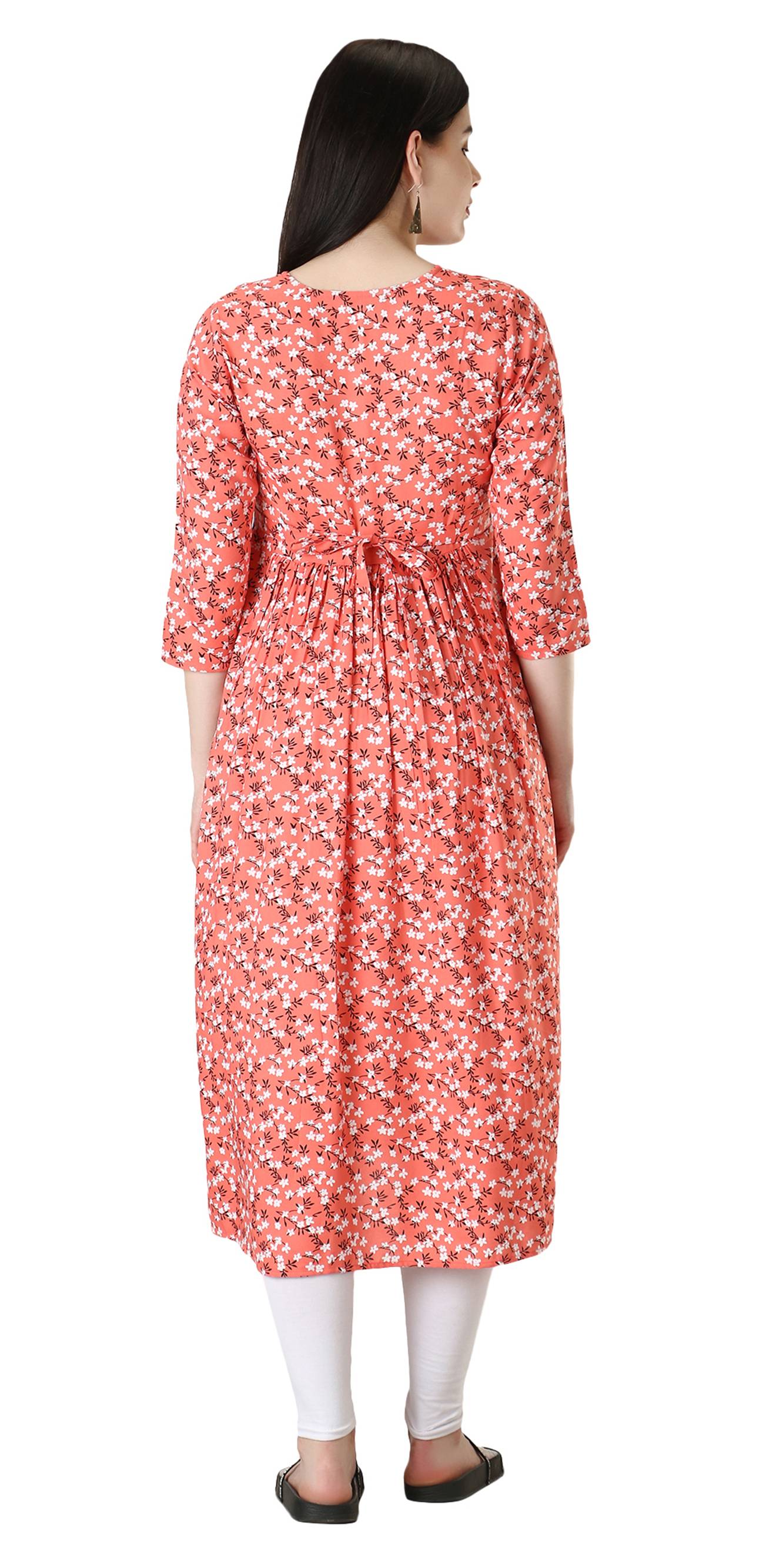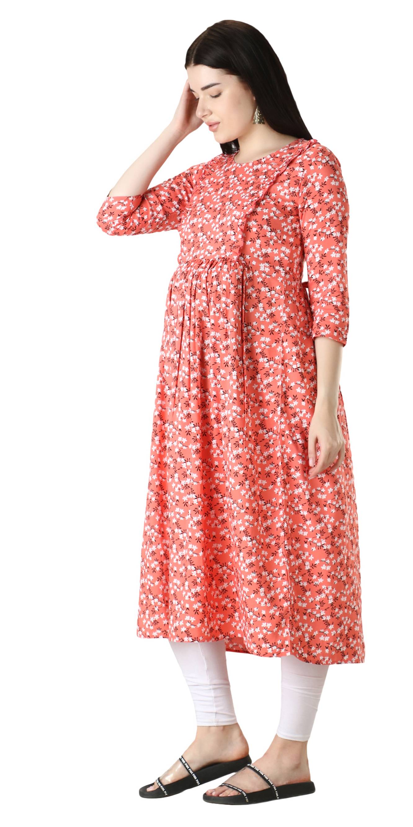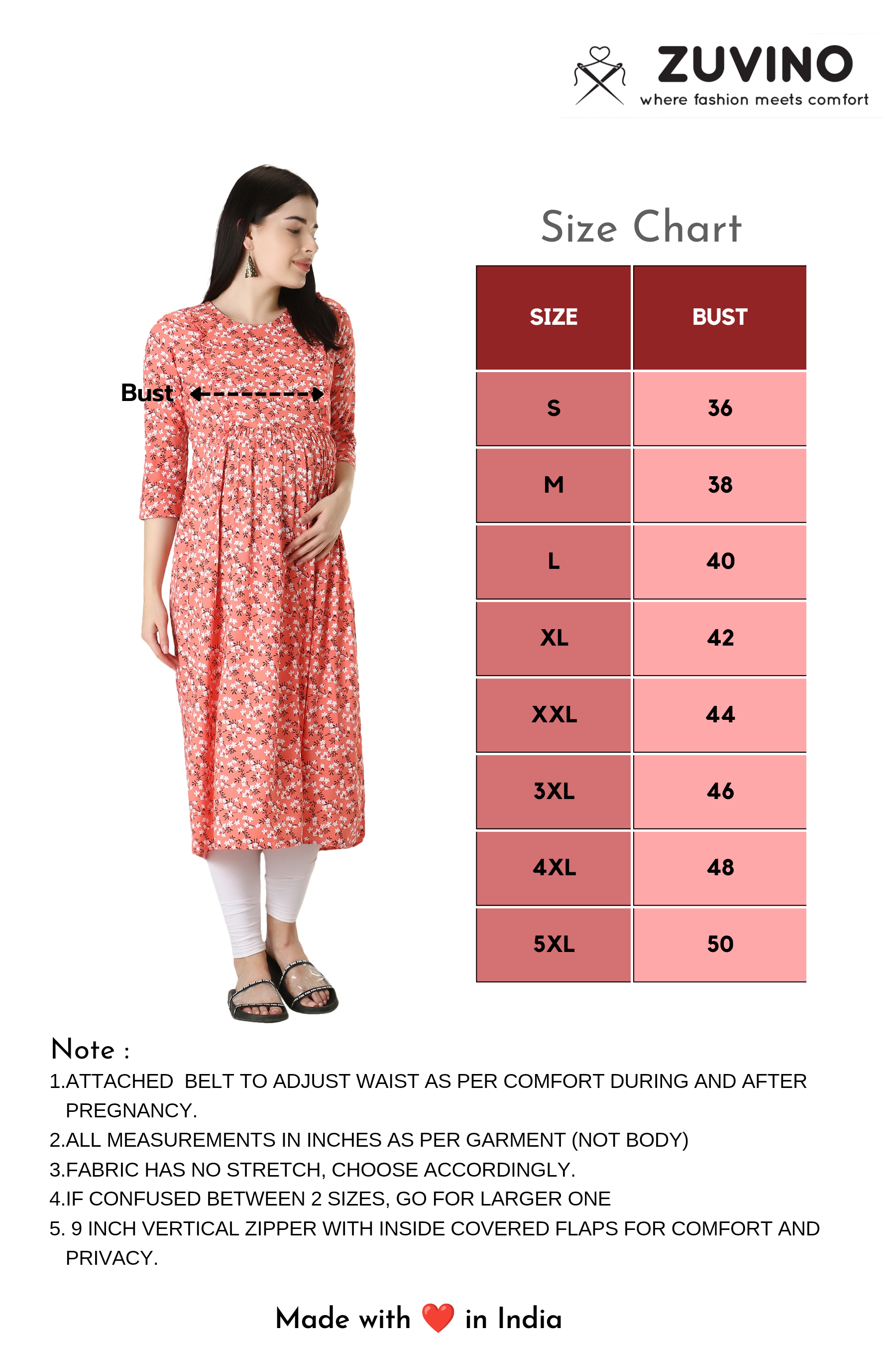 This maternity kurta for feeding is perfect outfit for mothers who are looking for comfortable yet stylish nursing dress for baby. It features easy to wear round neck, pleats around tummy area to hide baby bump in style. Belt is attached at waist to adjust fitting as per your own choice & comfort. This maternity dress features 9 inch concealed zippers on both sides for easy access in breast feeding, these are hidden under beautifully patterned frills, stitched on it with perfection. It can be used as daily wear, office wear or maternity gown dress for photo shoot also. Made up of super soft, breathable & non-transparent viscose rayon fabrics, this dress assures all day comfort, quality & value for money. This maternity kurti can be paired up with leggings or you can also carry this as a nursing dress easily. Use this anytime pre & post pregnancy duration as this can be styled as normal dress or kurti as well. We always put your comfort and satisfaction first; all our products are designed and crafted keeping you in mind.