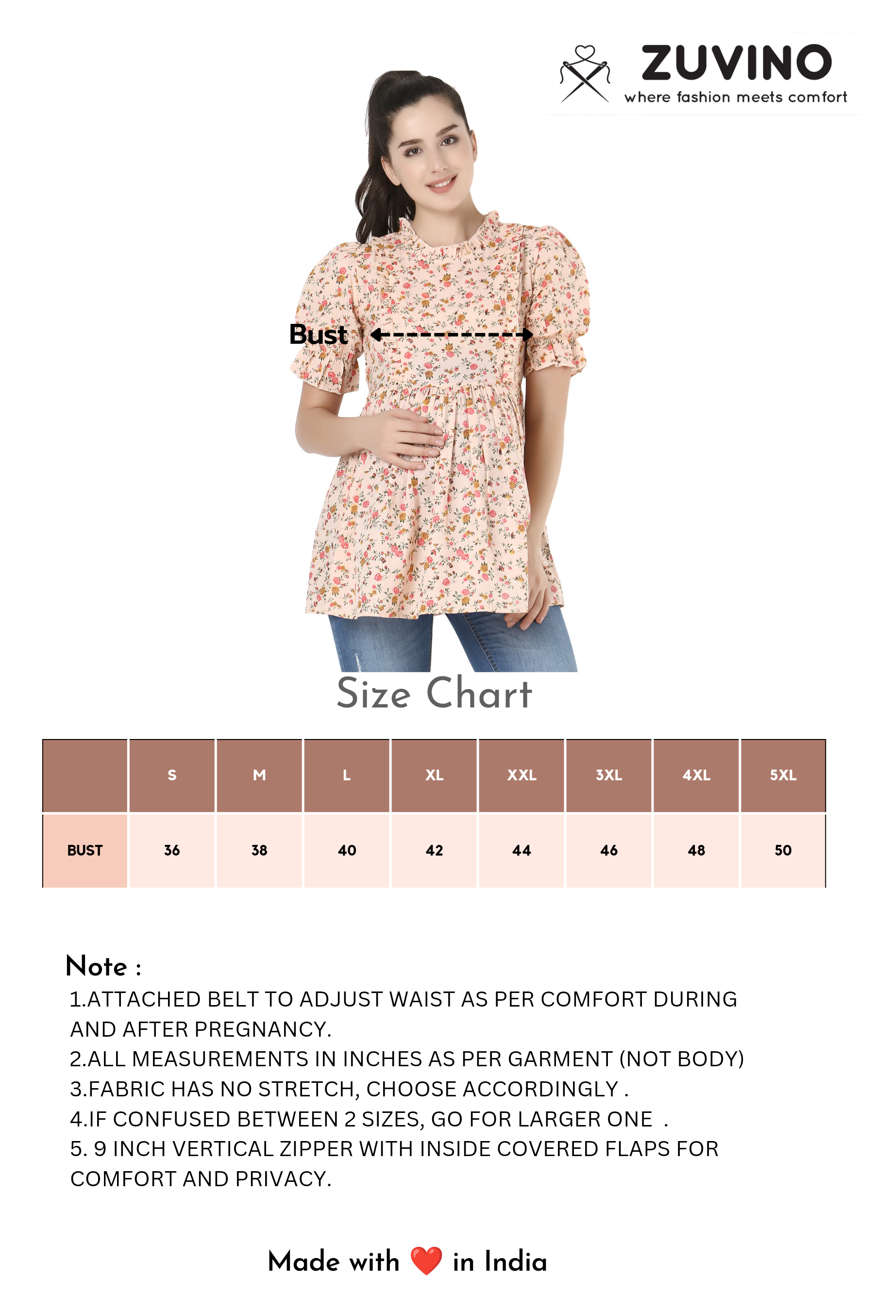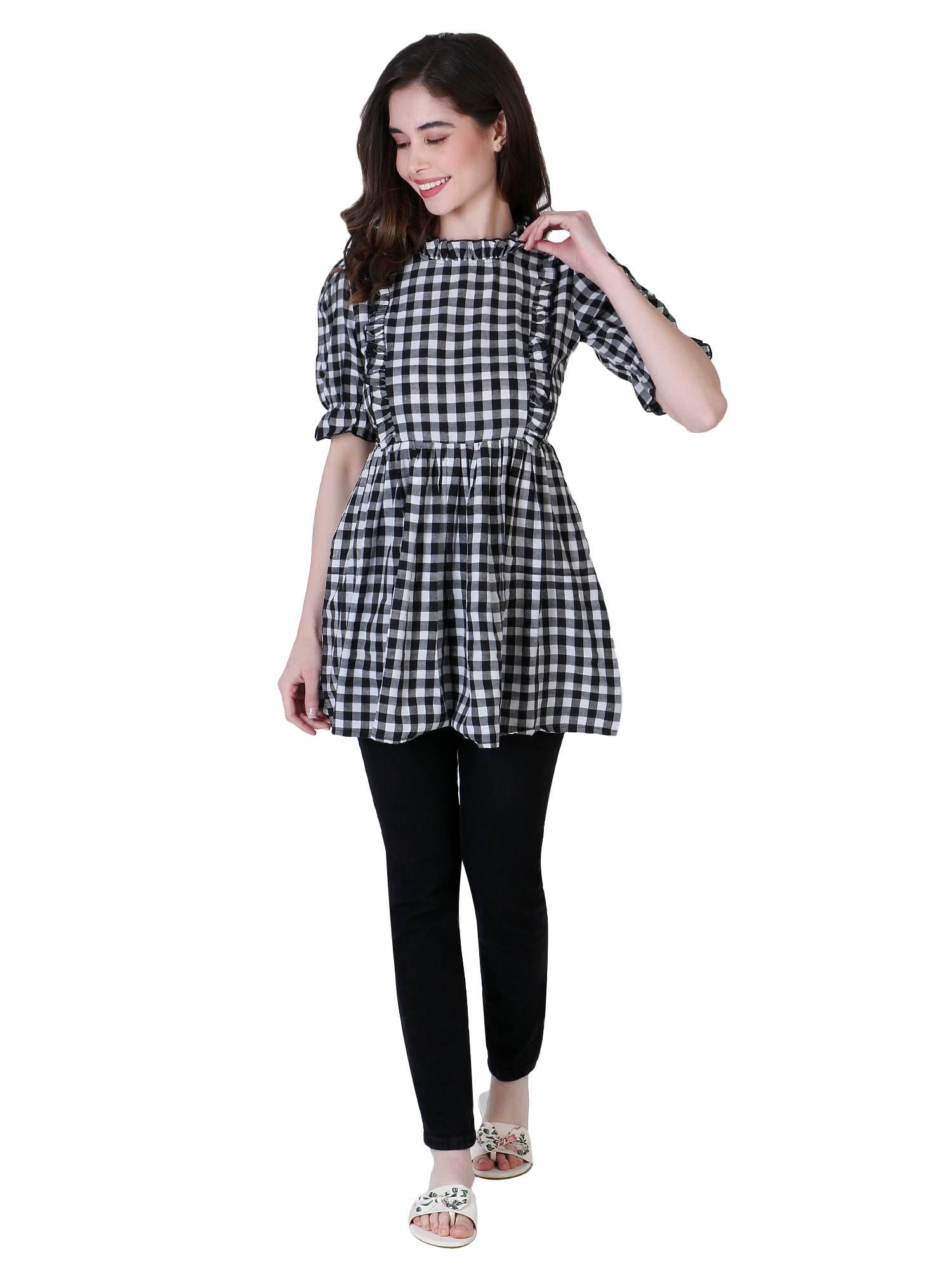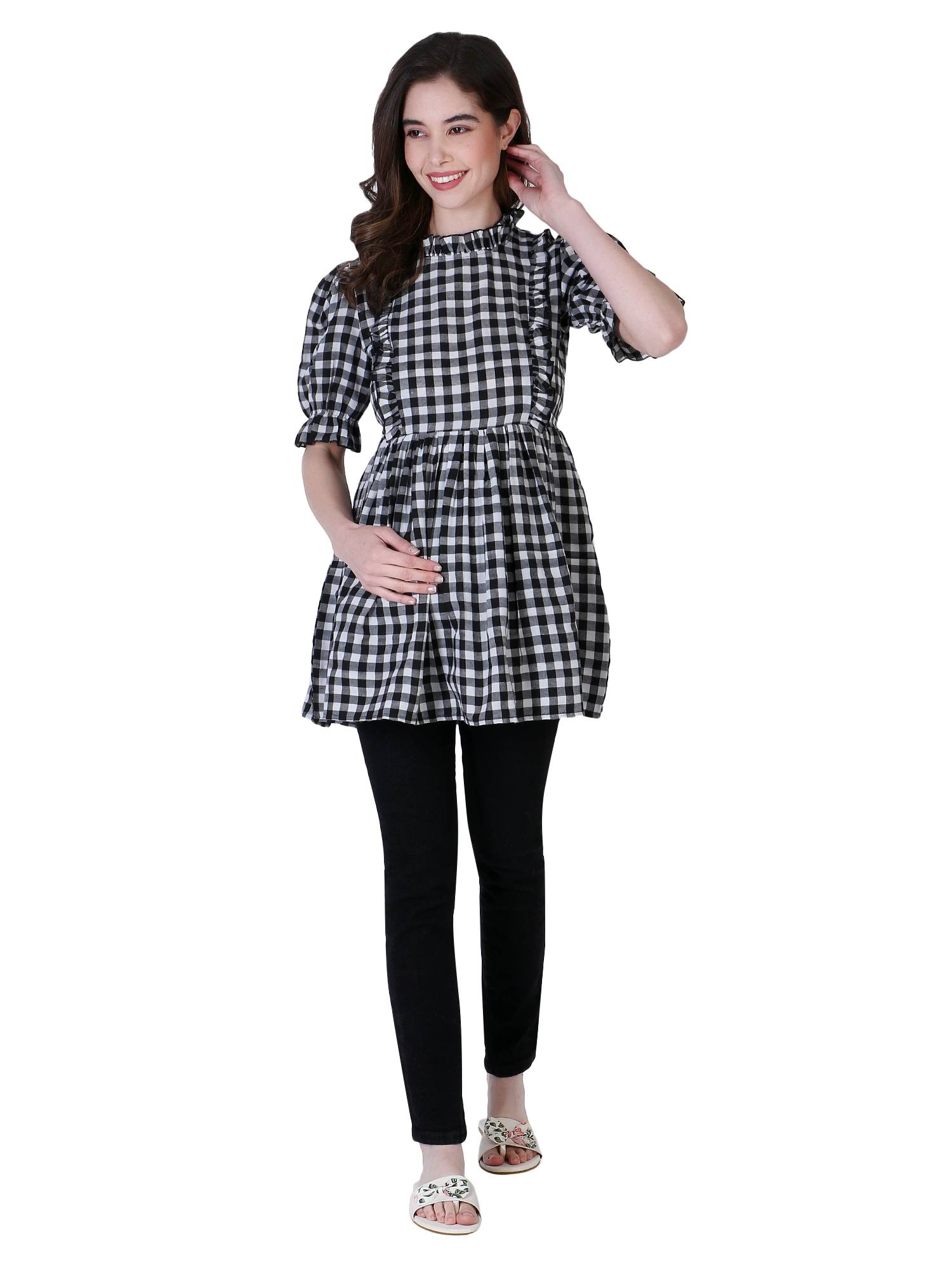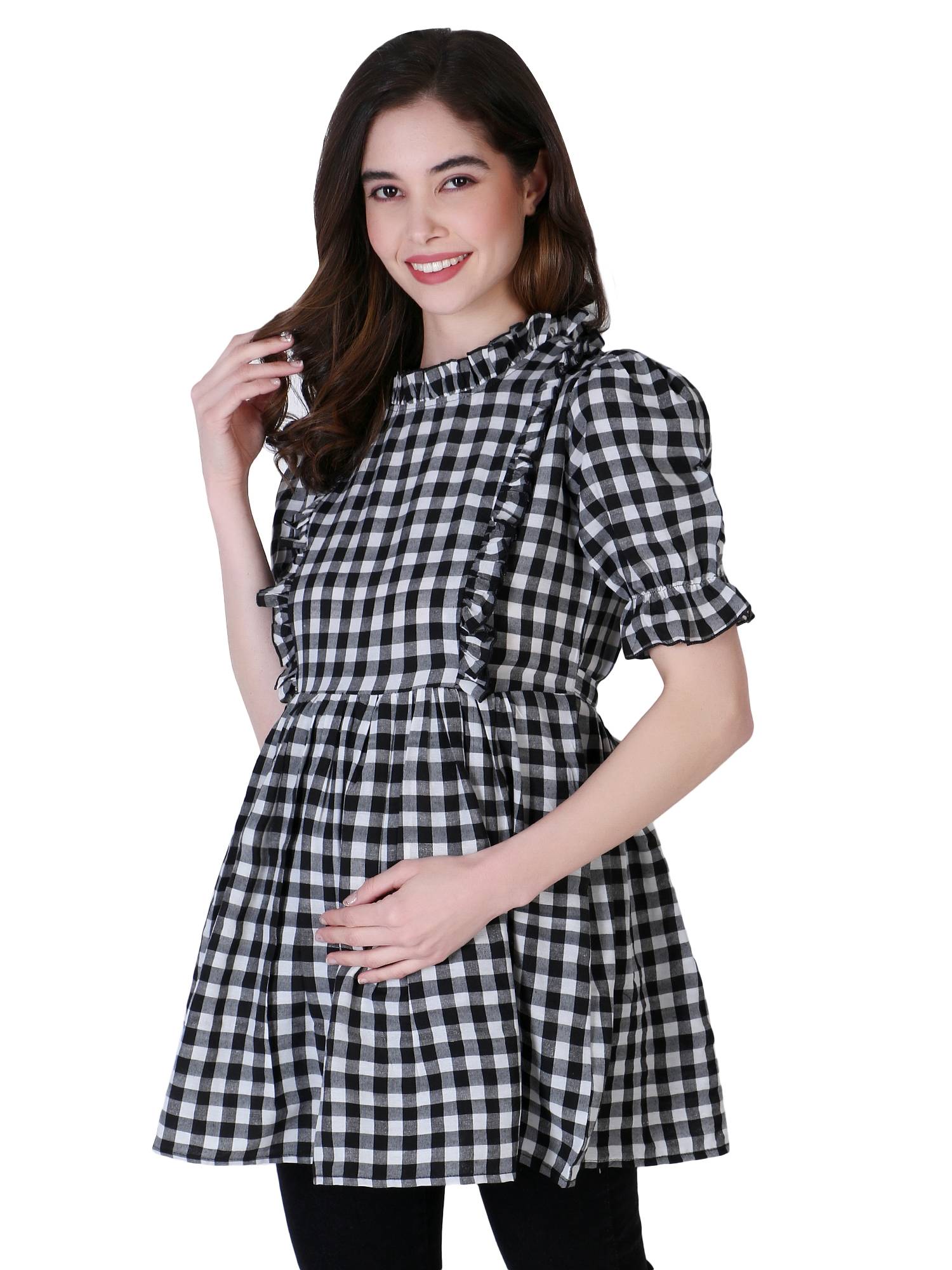 Adding one more style to our most loved collection of feeding tops for mothers with zip, We are launching beautiful maternity tops for women in latest prints and patterns. These nursing tops for feeding women features short puffed sleeves ruffled at bottom for trendy look. We understand that feeding tops for women are essential part of maternity and nursing clothes. Keeping this in mind we made these feeding tops for jeans with ruffled neckline and back keyhole. These mother tops for feeding with zip has 9 inch vertical zipper hidden neatly under beautiful frills stitched with perfection. Zips are covered from inside with fabric placket to ensure your comfort and privacy during breastfeeding baby. These plus size maternity tops for pregnancy has pleats on stomach area with attached belt at waist to ensure best fitting during and post pregnancy. These feeding cotton tops under 500 can be styled as short maternity kurti also. Our mother tops with zip are perfect for everyday wear, casual wear or office wear. These easy feeding tops for women can be ideal outfit for photoshoots or gifts for new moms. We work closely so every single piece is made with love and care to make sure you get only the best. Made up of cotton handloom these comfortable yet stylish check tops are sure to add charm to your mom to be wardrobe.