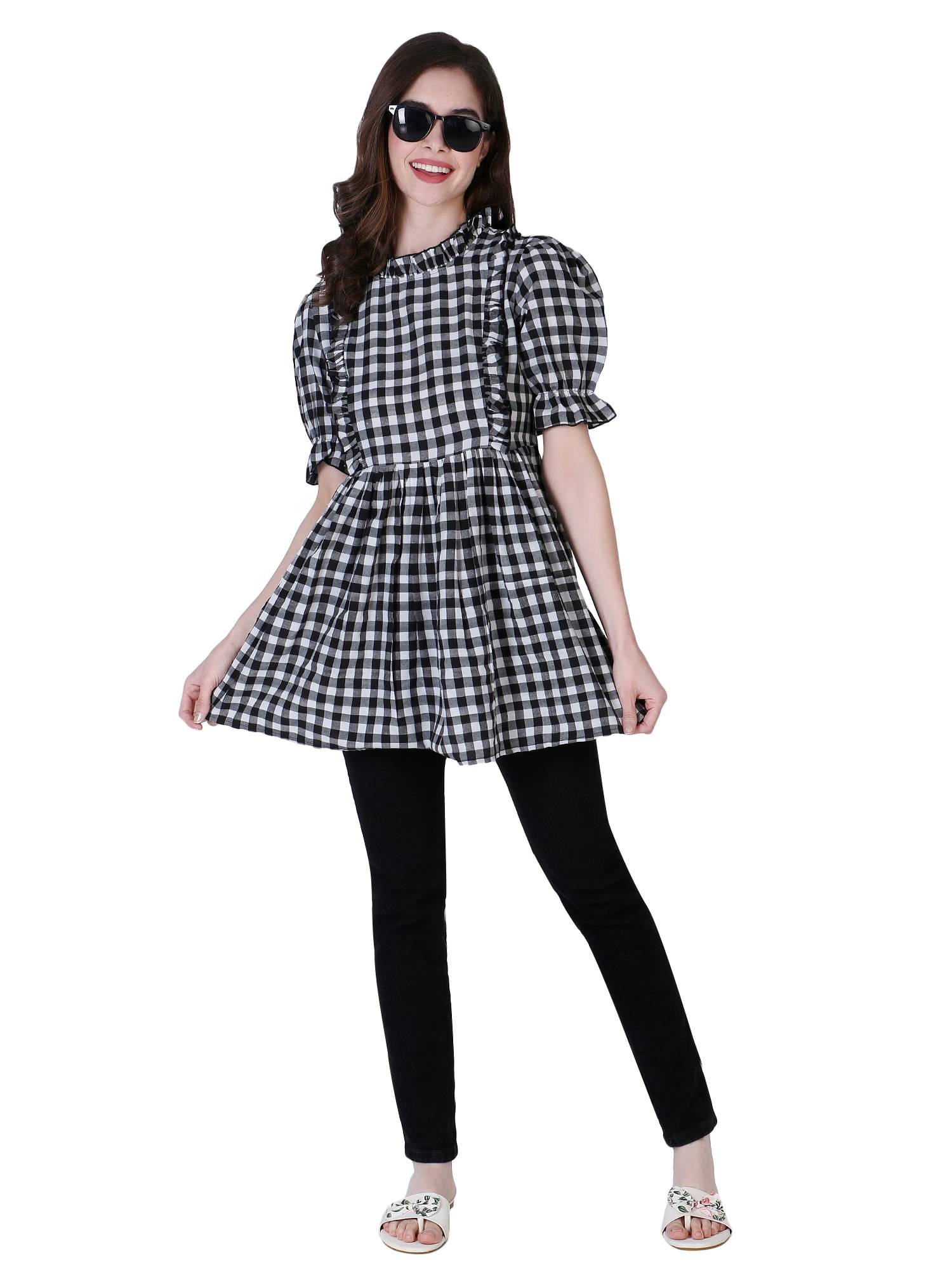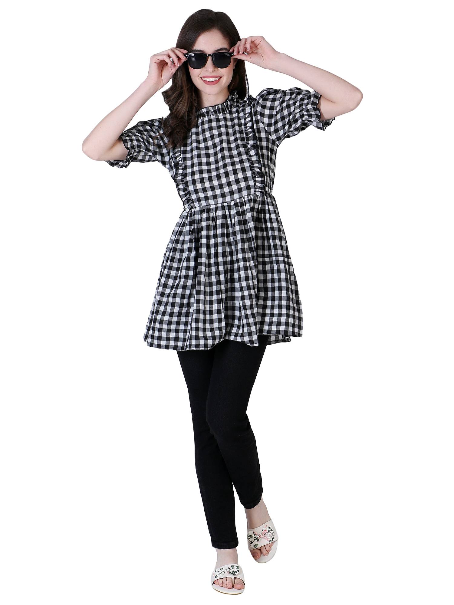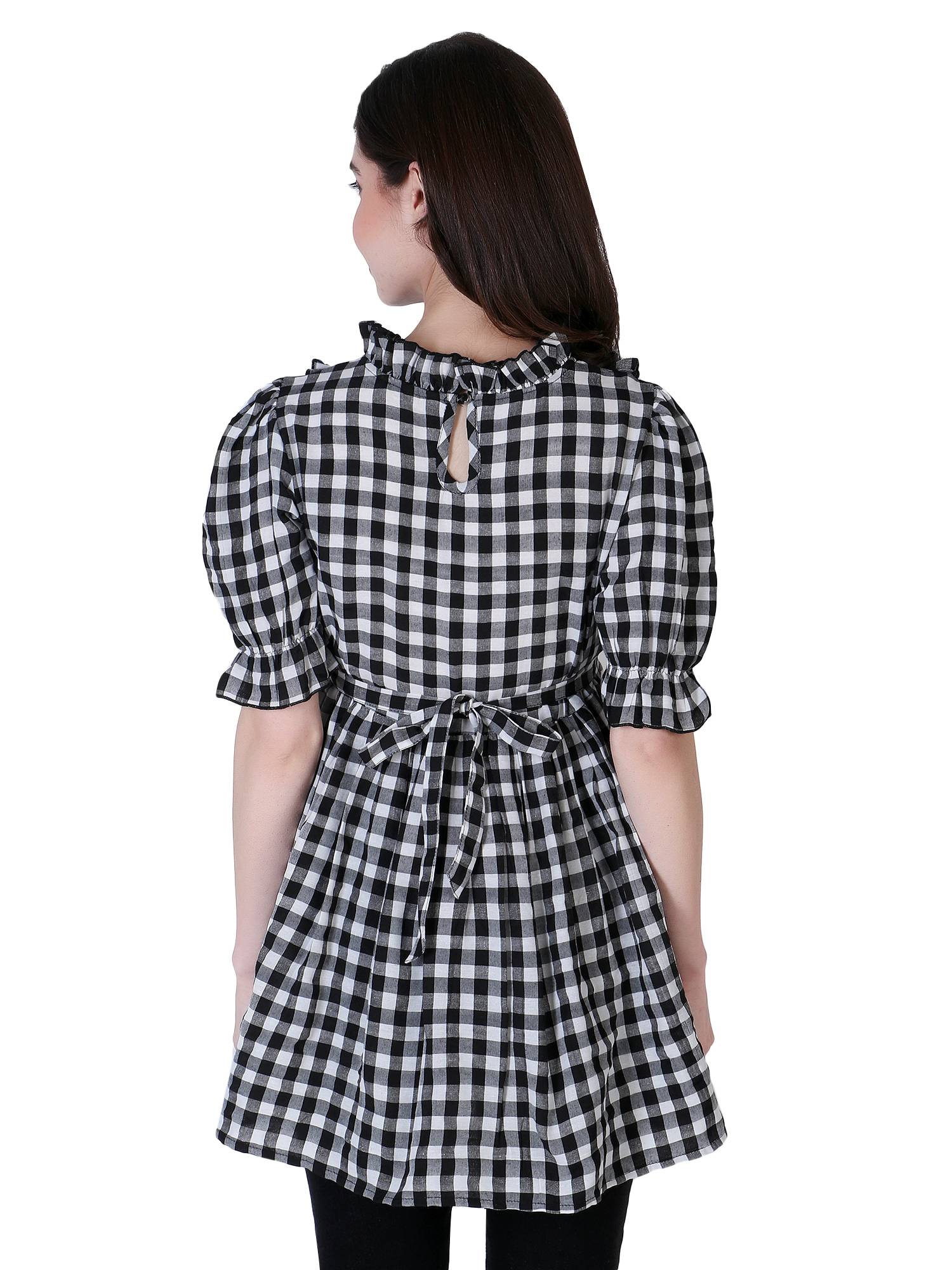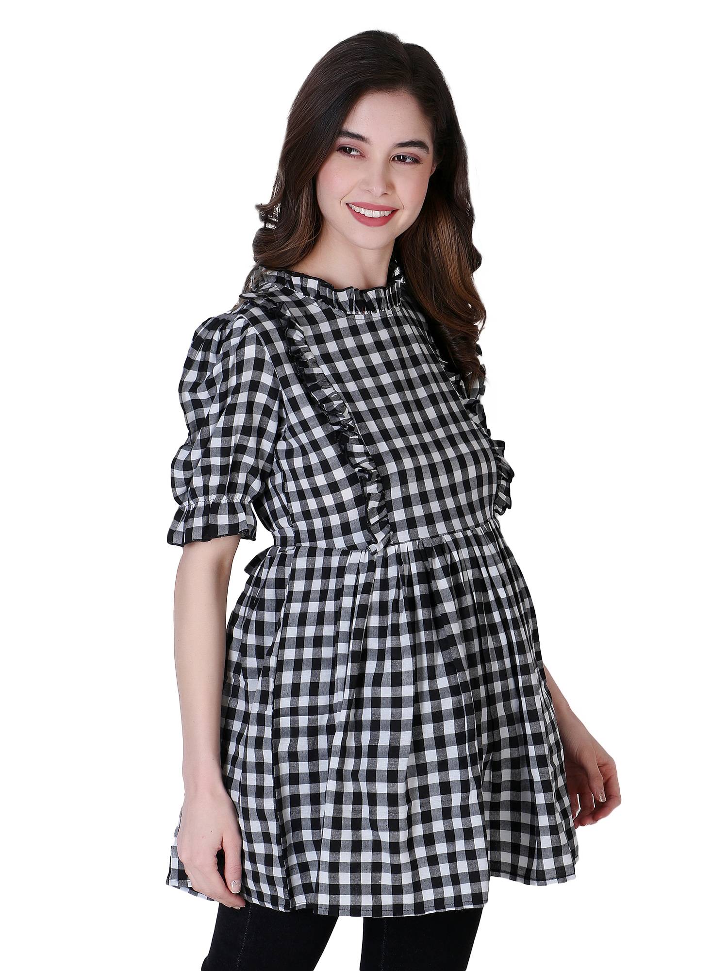 Adding one more style to our most loved collection of feeding tops for mothers with zip, We are launching beautiful maternity tops for women in latest prints and patterns. These nursing tops for feeding women features short puffed sleeves ruffled at bottom for trendy look. We understand that feeding tops for women are essential part of maternity and nursing clothes. Keeping this in mind we made these feeding tops for jeans with ruffled neckline and back keyhole. These mother tops for feeding with zip has 9 inch vertical zipper hidden neatly under beautiful frills stitched with perfection. Zips are covered from inside with fabric placket to ensure your comfort and privacy during breastfeeding baby. These plus size maternity tops for pregnancy has pleats on stomach area with attached belt at waist to ensure best fitting during and post pregnancy. These feeding cotton tops under 500 can be styled as short maternity kurti also. Our mother tops with zip are perfect for everyday wear, casual wear or office wear. These easy feeding tops for women can be ideal outfit for photoshoots or gifts for new moms. We work closely so every single piece is made with love and care to make sure you get only the best. Made up of cotton handloom these comfortable yet stylish check tops are sure to add charm to your mom to be wardrobe.