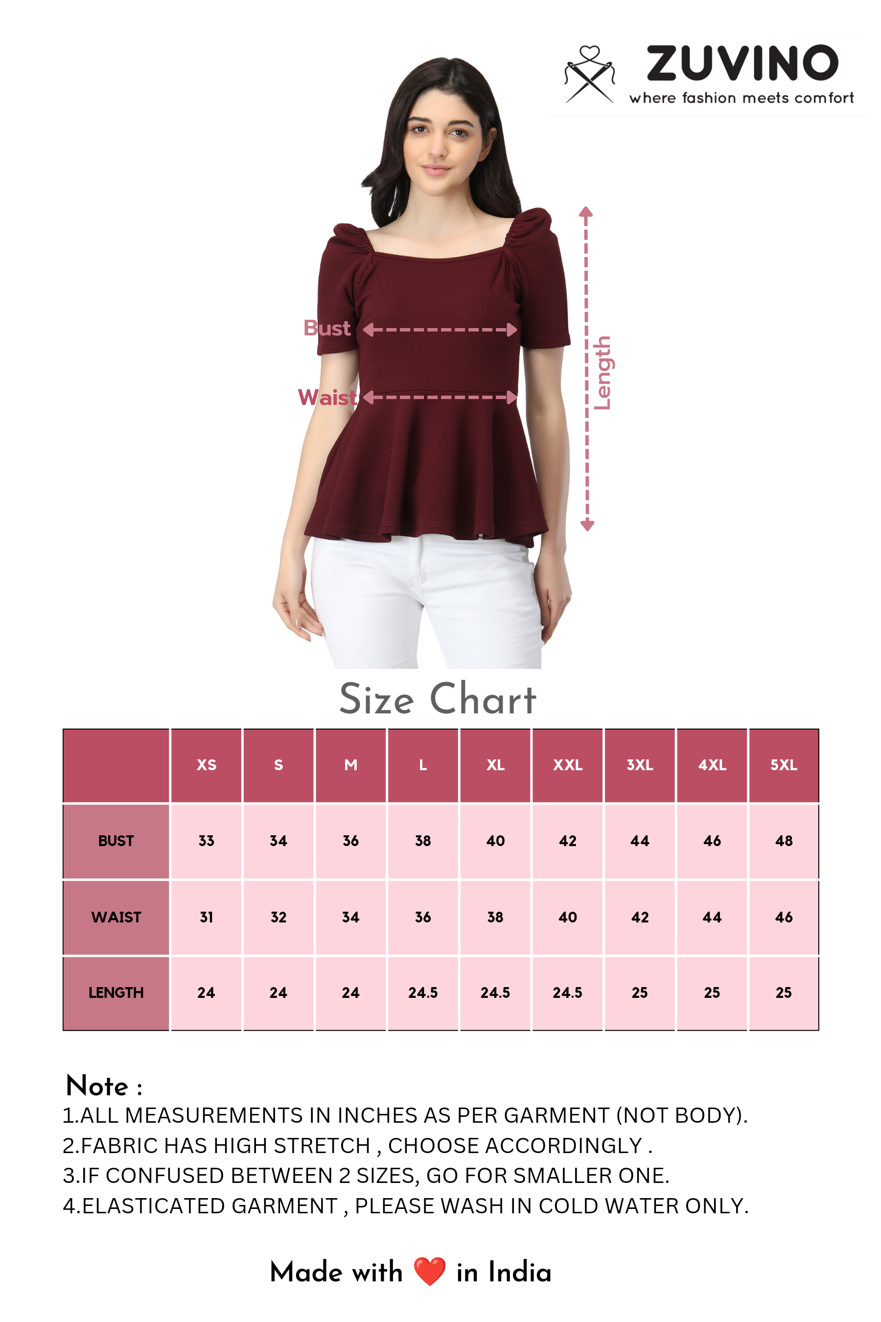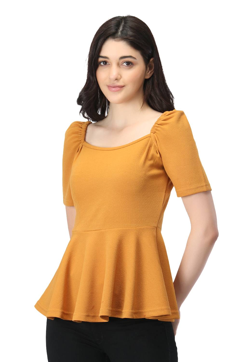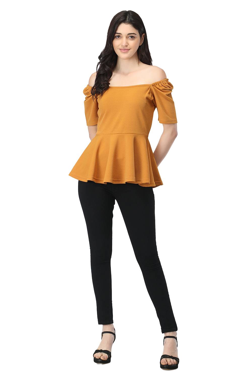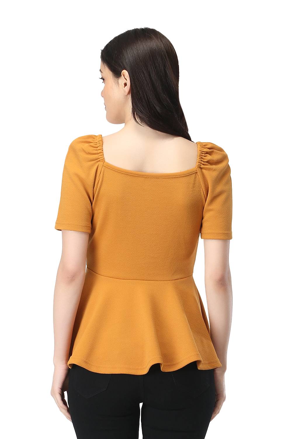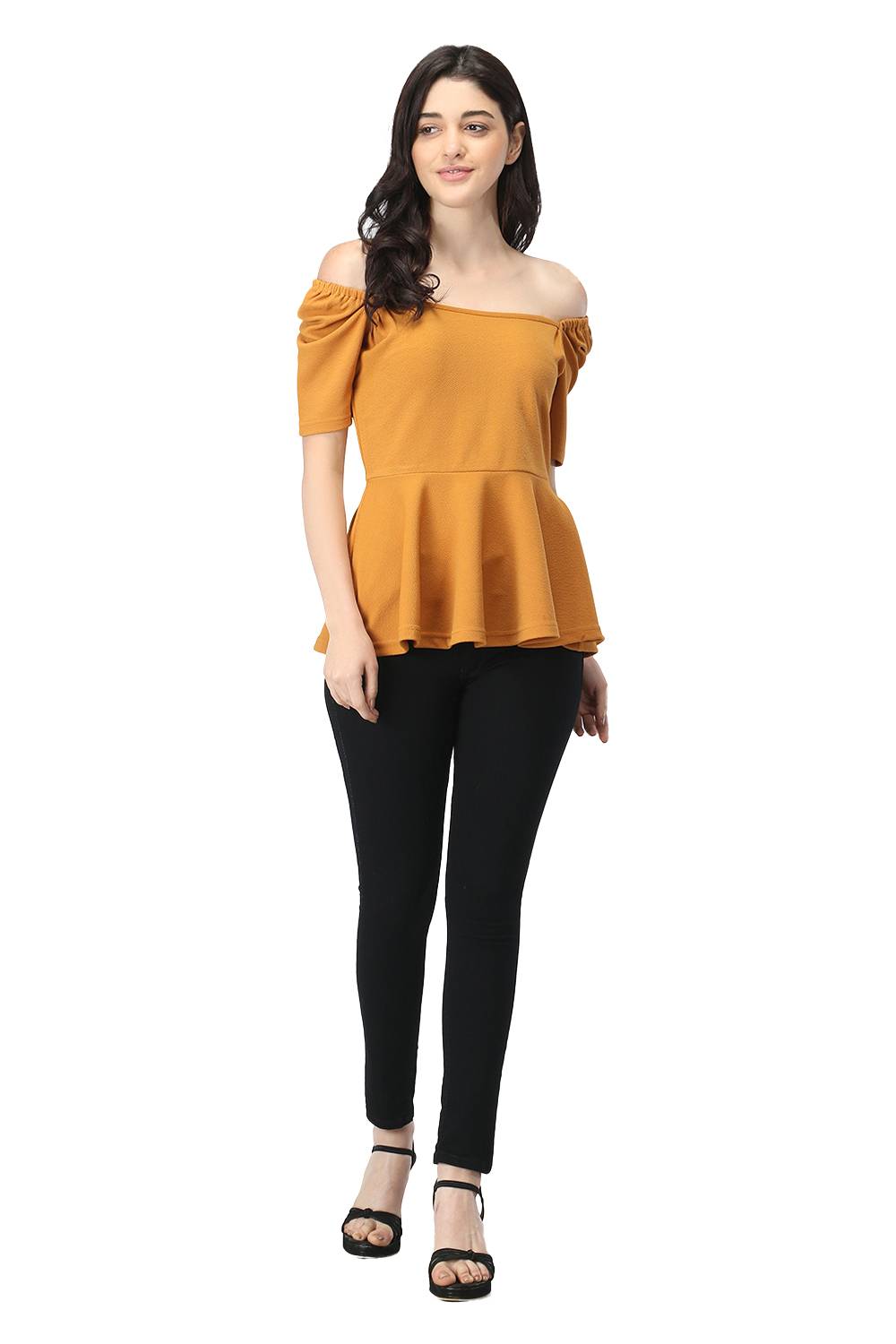 Get your hands on this stylish peplum top that features a sweetheart neckline along with elasticated puffed sleeves, made up with super comfortable stretchable fabric that has a self design in it. You can also wear this western dual way top as an off shoulder top with jeans, trousers or skirt easily, to get trendy, semi-formal & fashionable look. Juliet sleeves are stitched with perfection so it gives a princess look. Pair this up with your favourite denims & heels to get that awesome valentine looks.