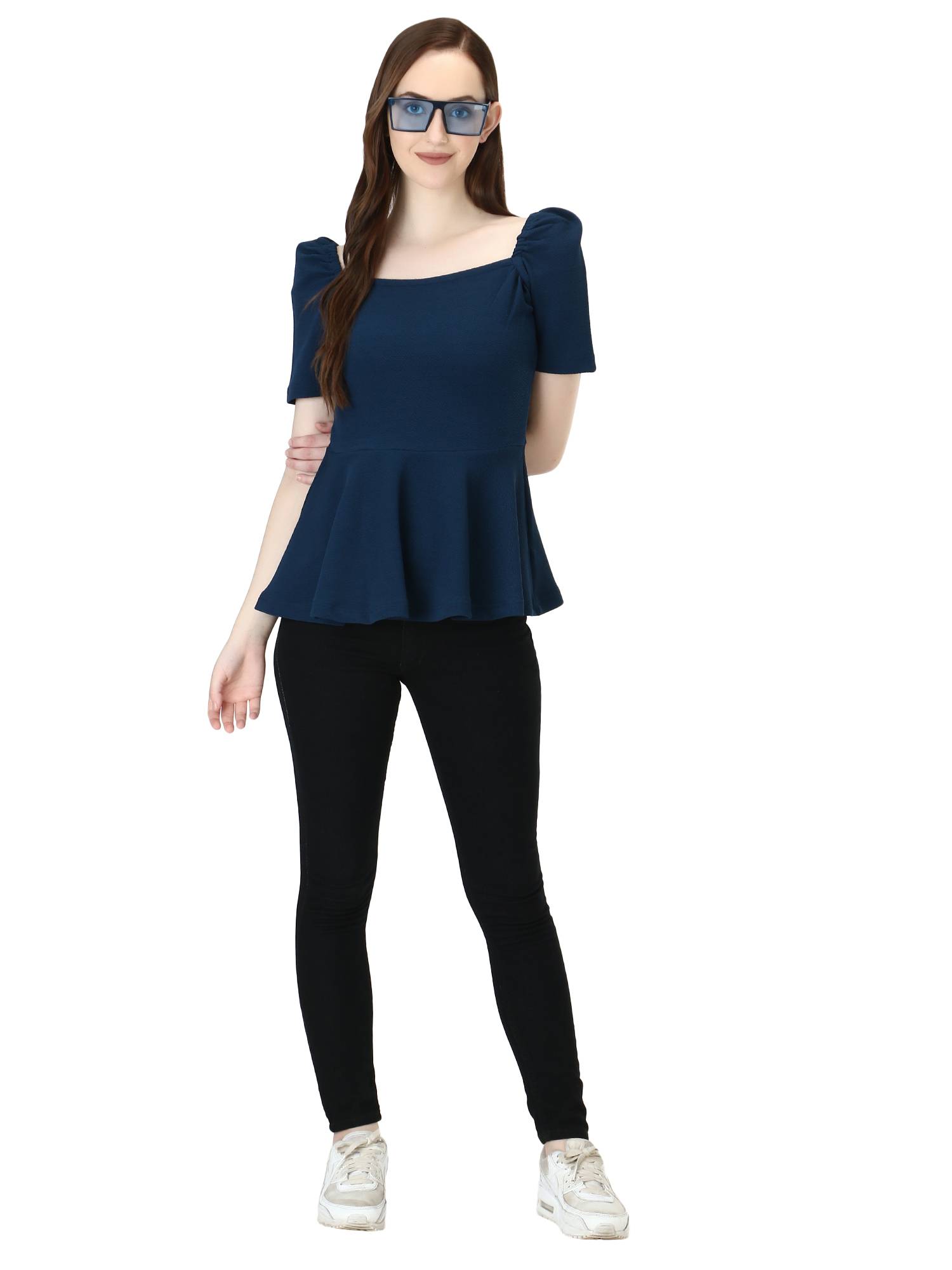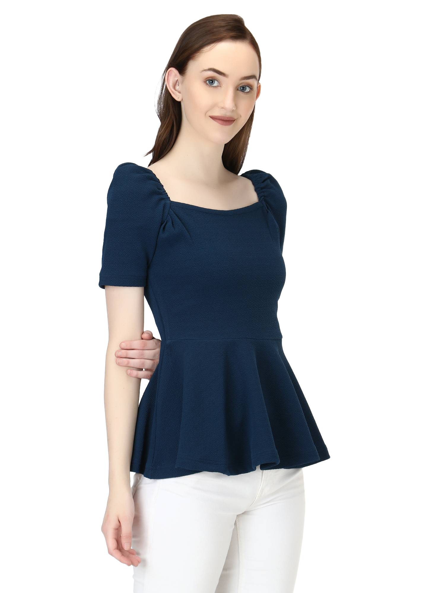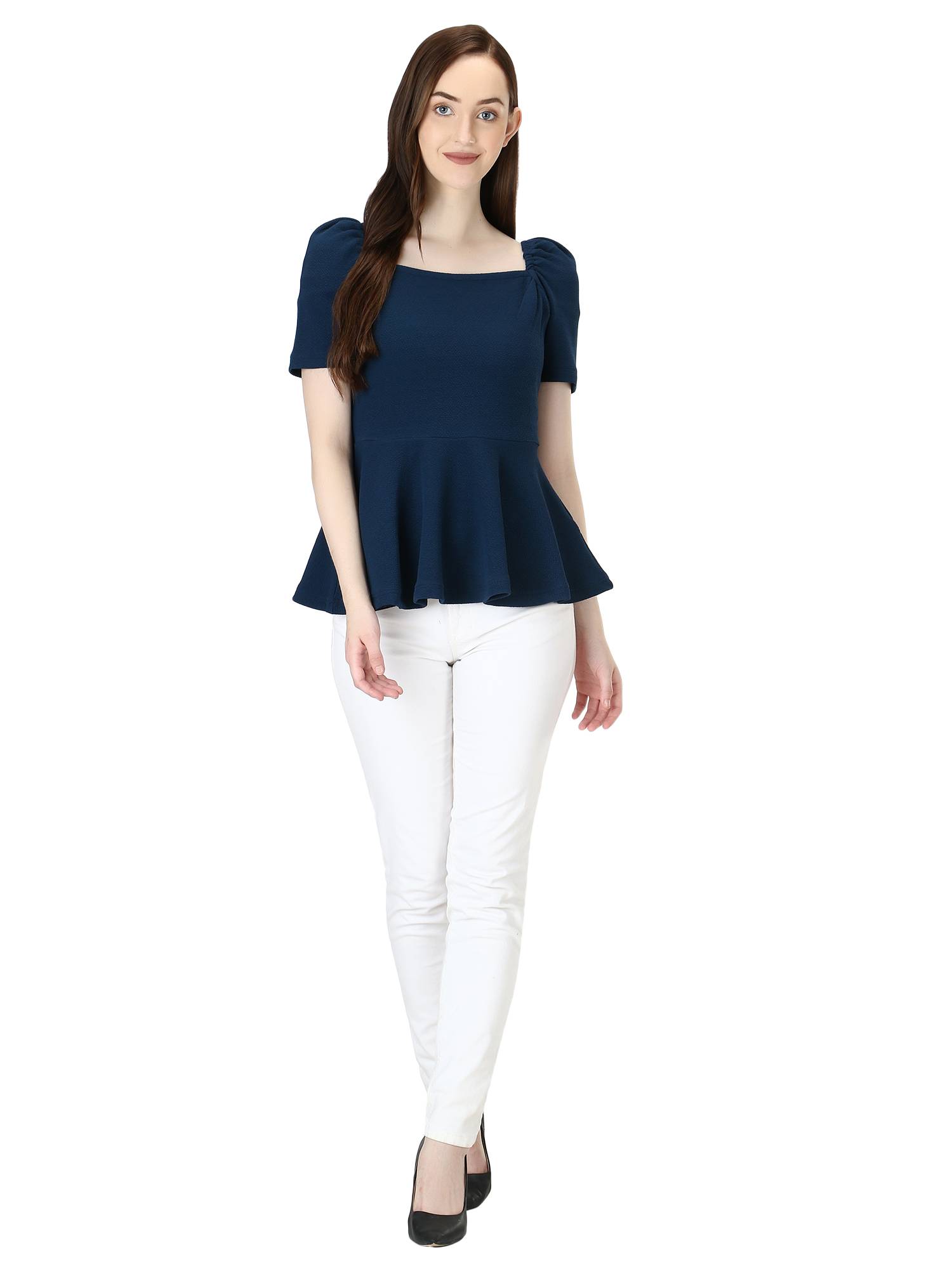 Puffed Sleeves Peplum Top. (Peacock)
