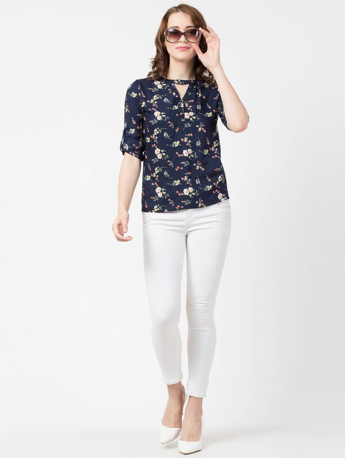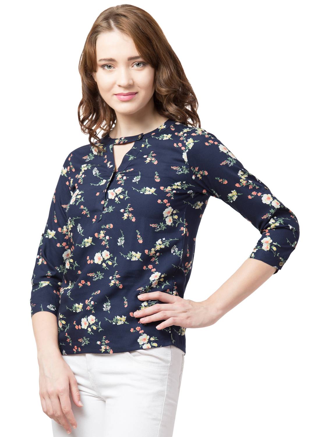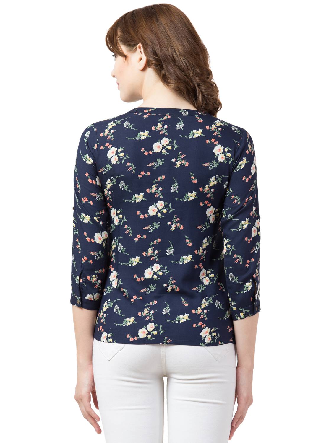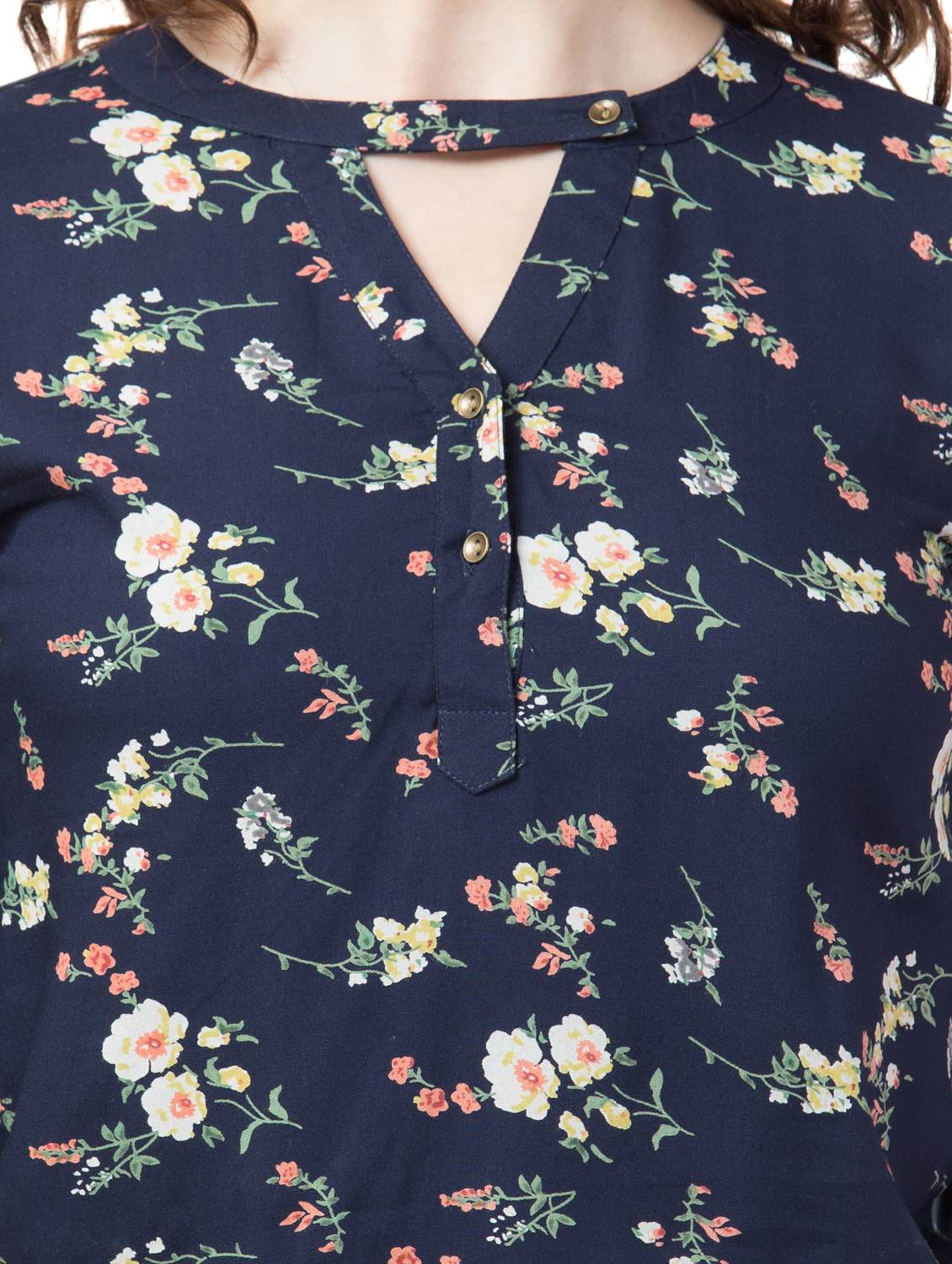 Rayon Floral Band Collar Top. (Navy Blue)