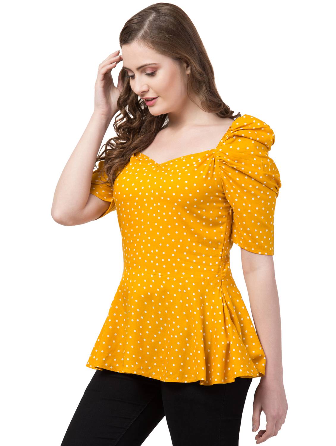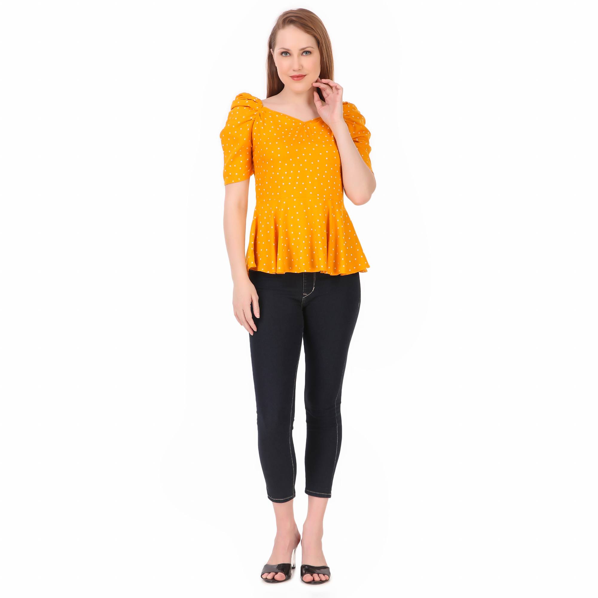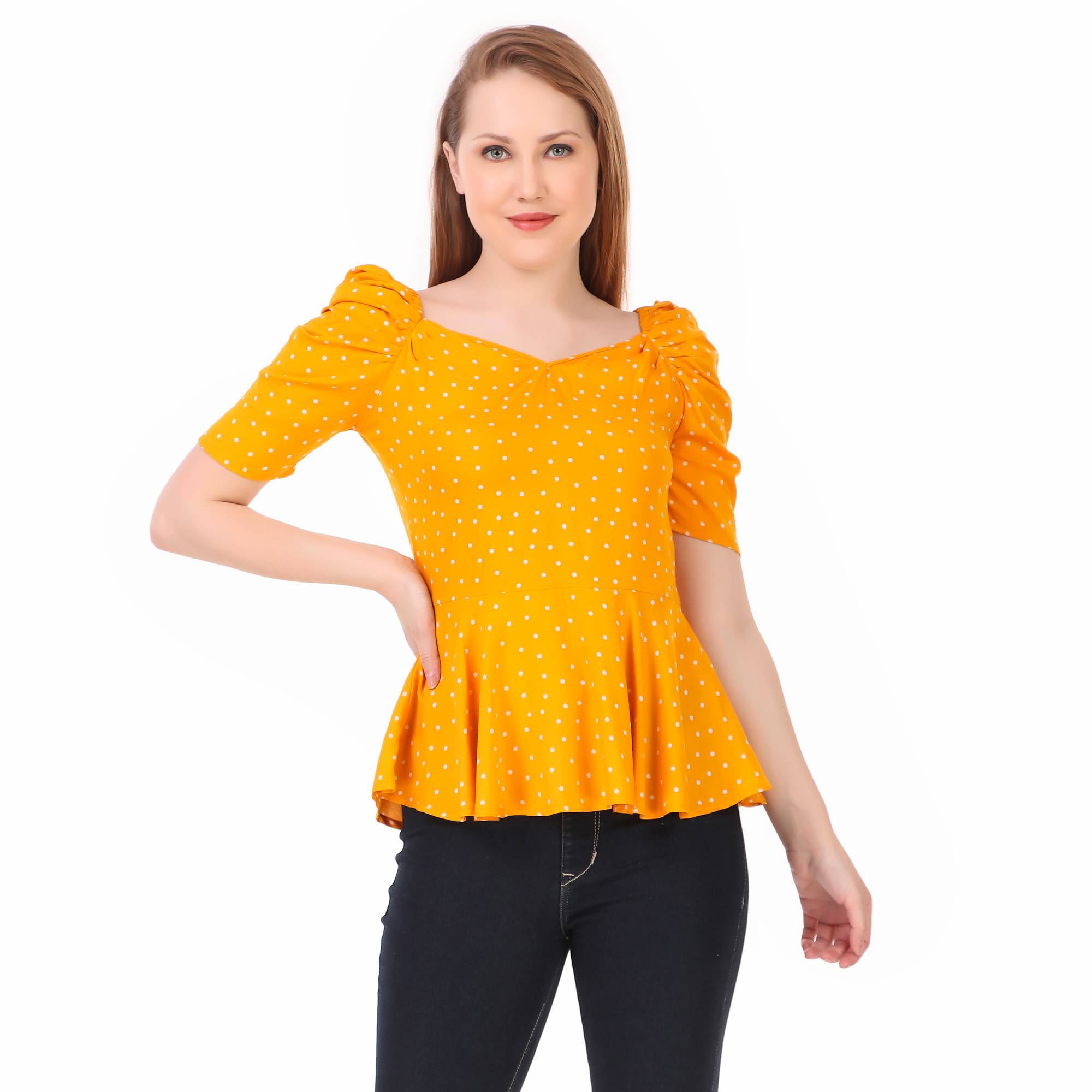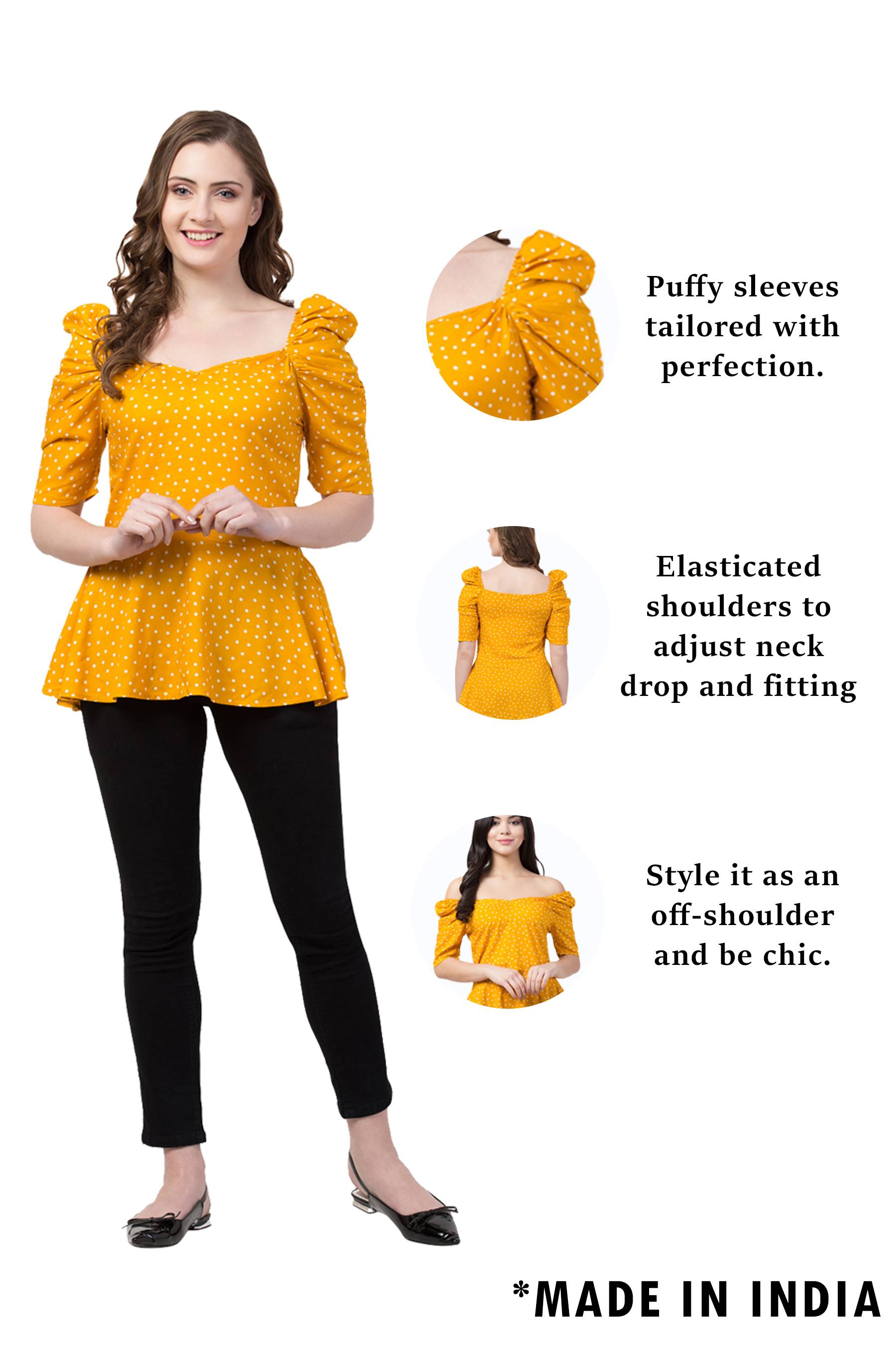 Rayon Polka Summer Peplum Top With Puffed Sleeves. (Mustard)