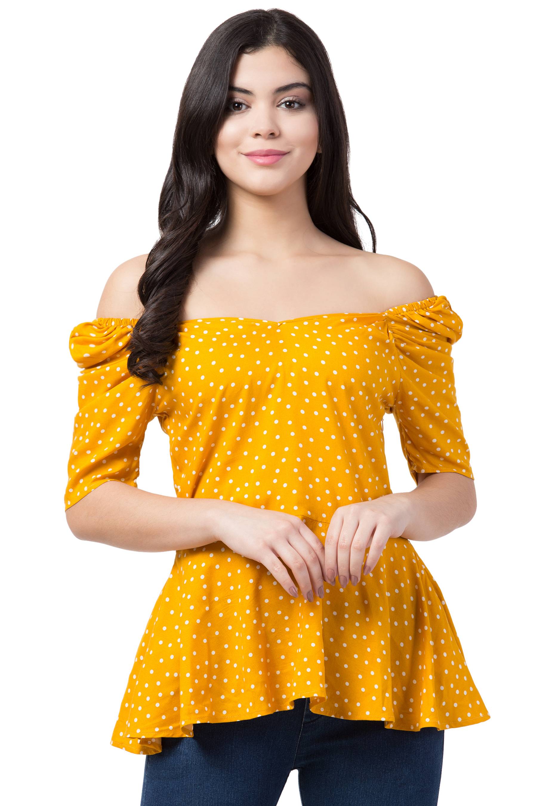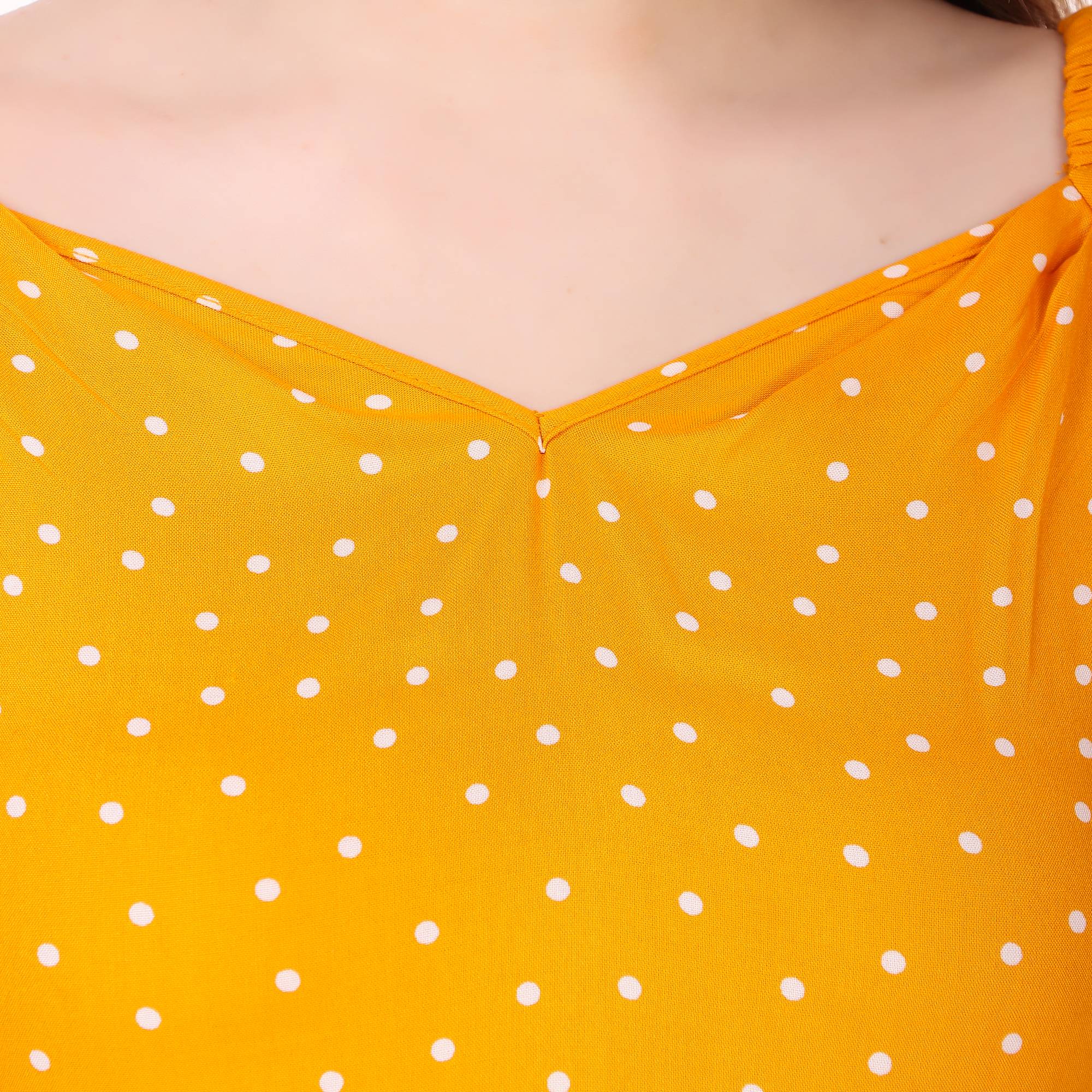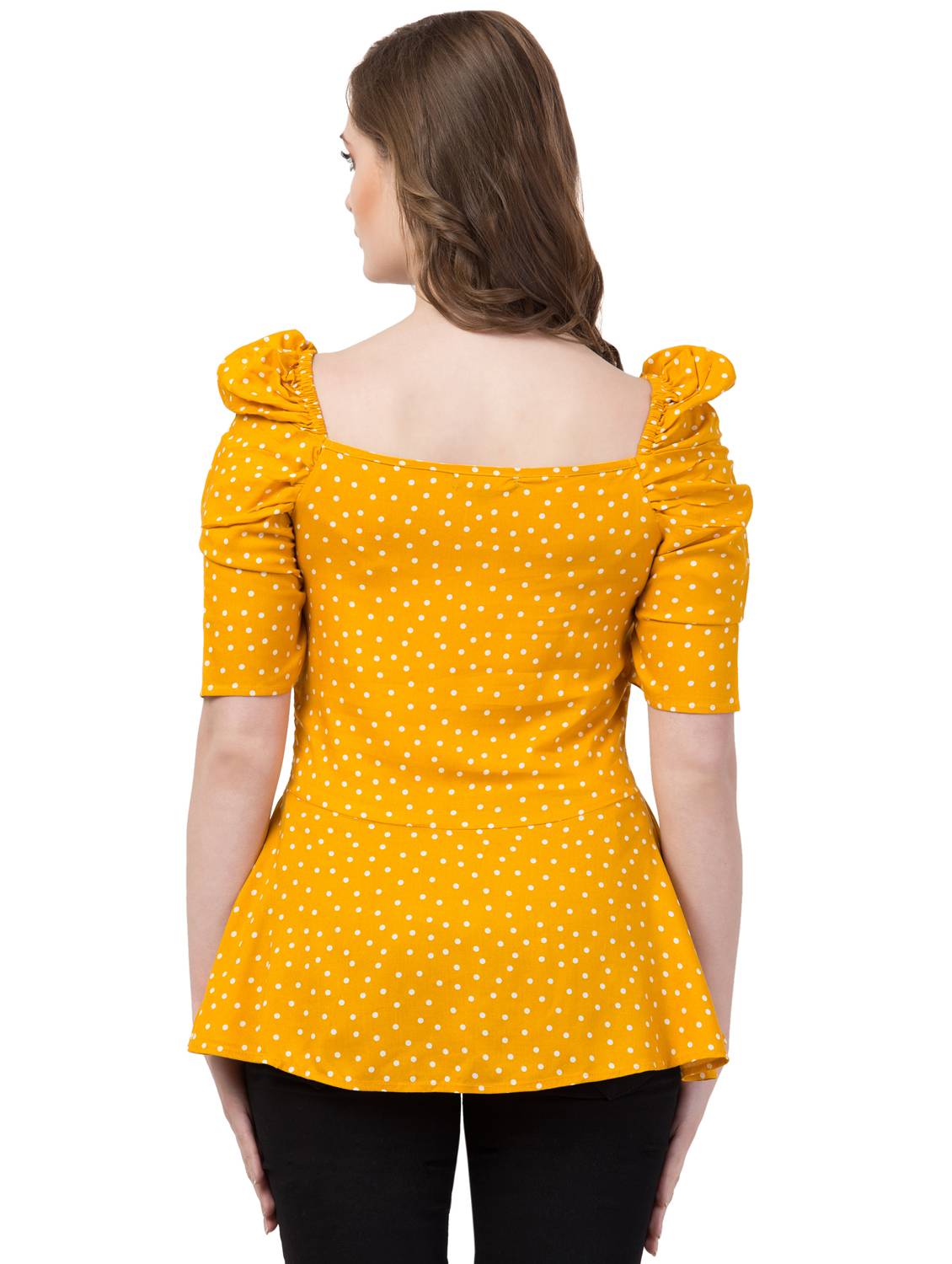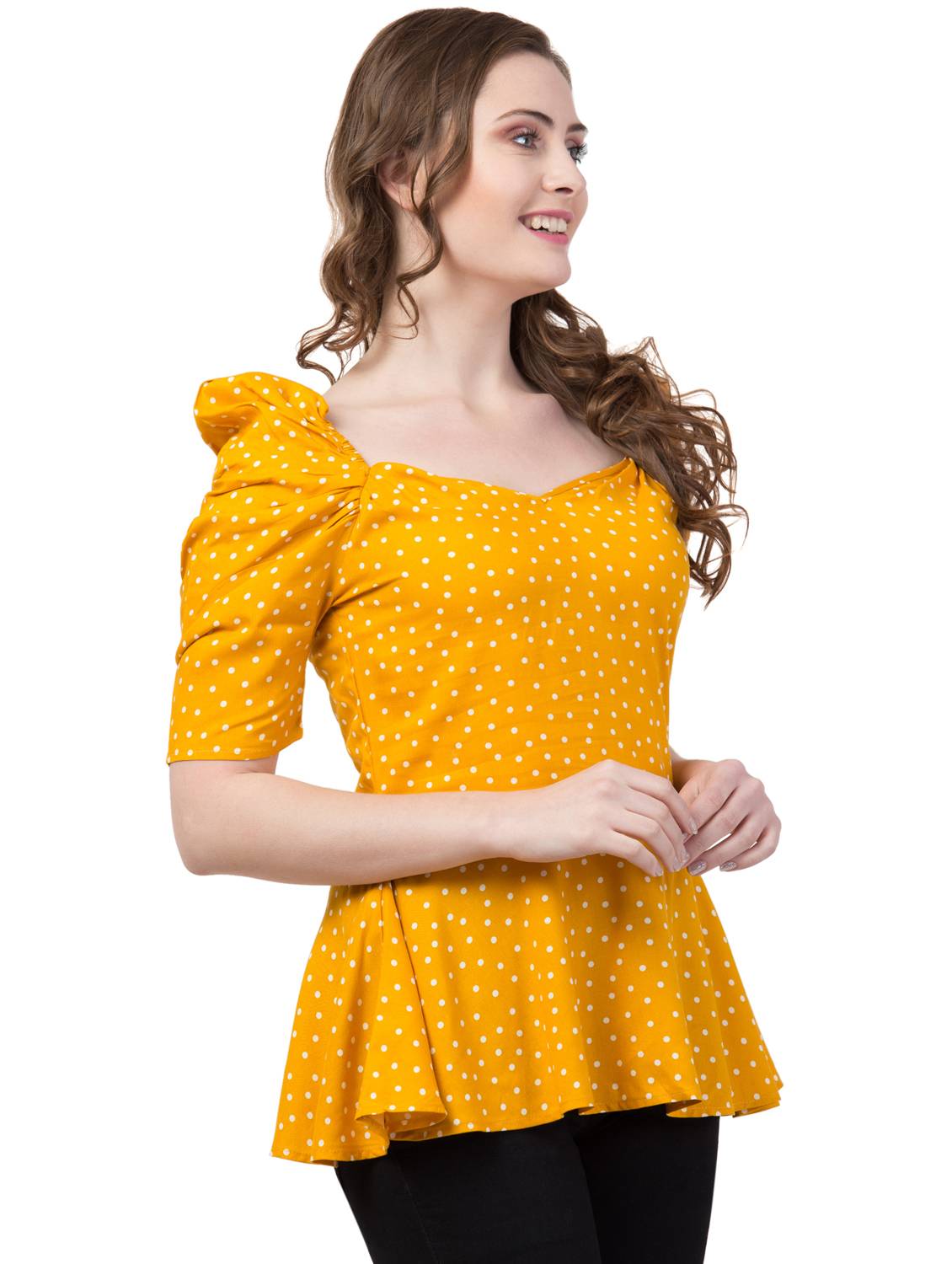 Rayon Polka Summer Peplum Top With Puffed Sleeves. (Mustard)