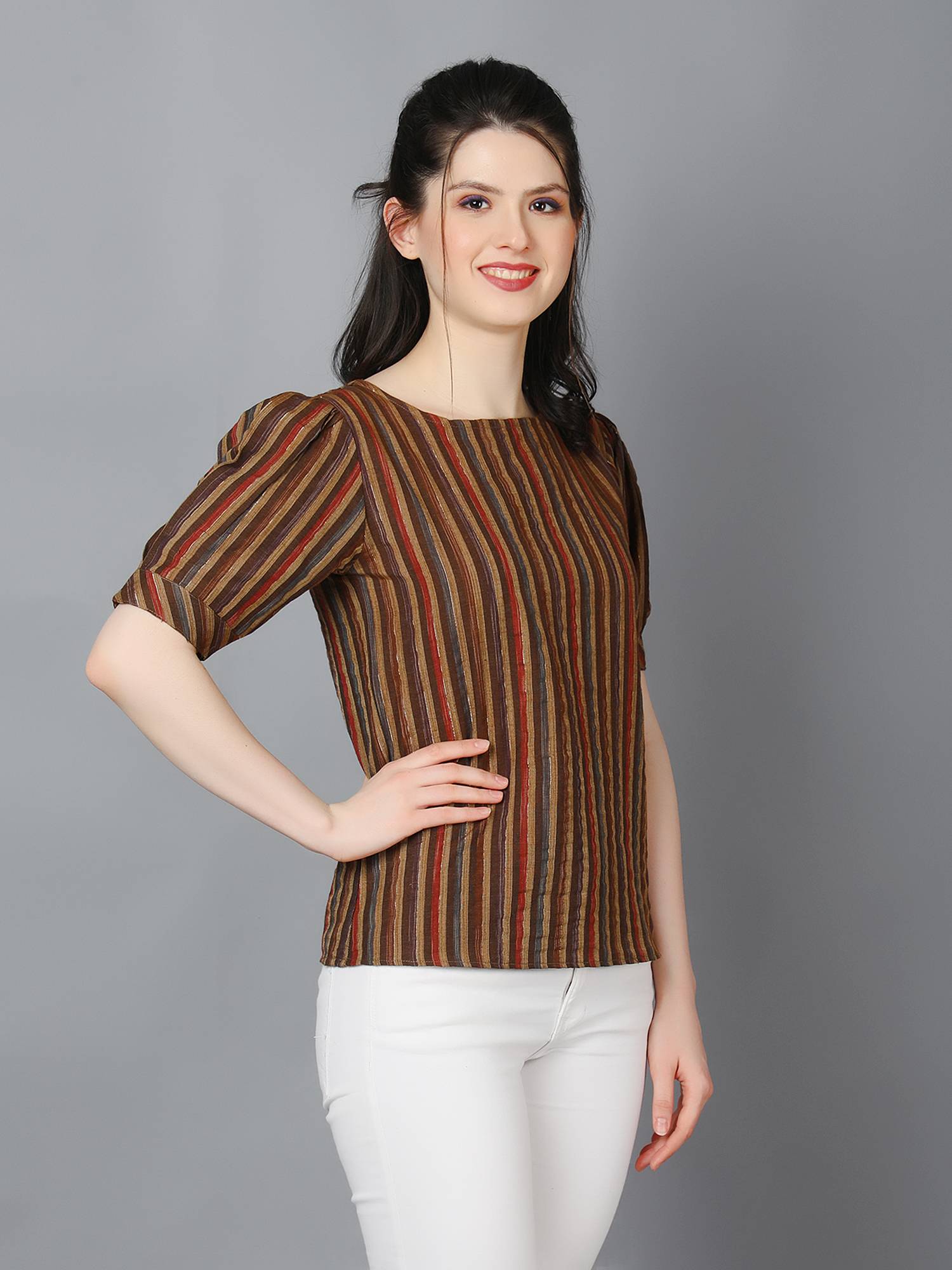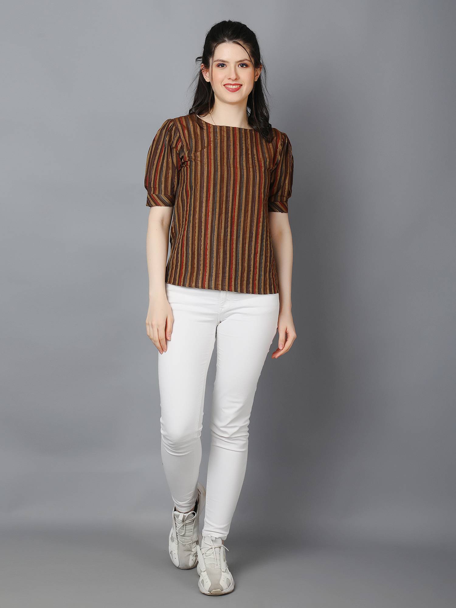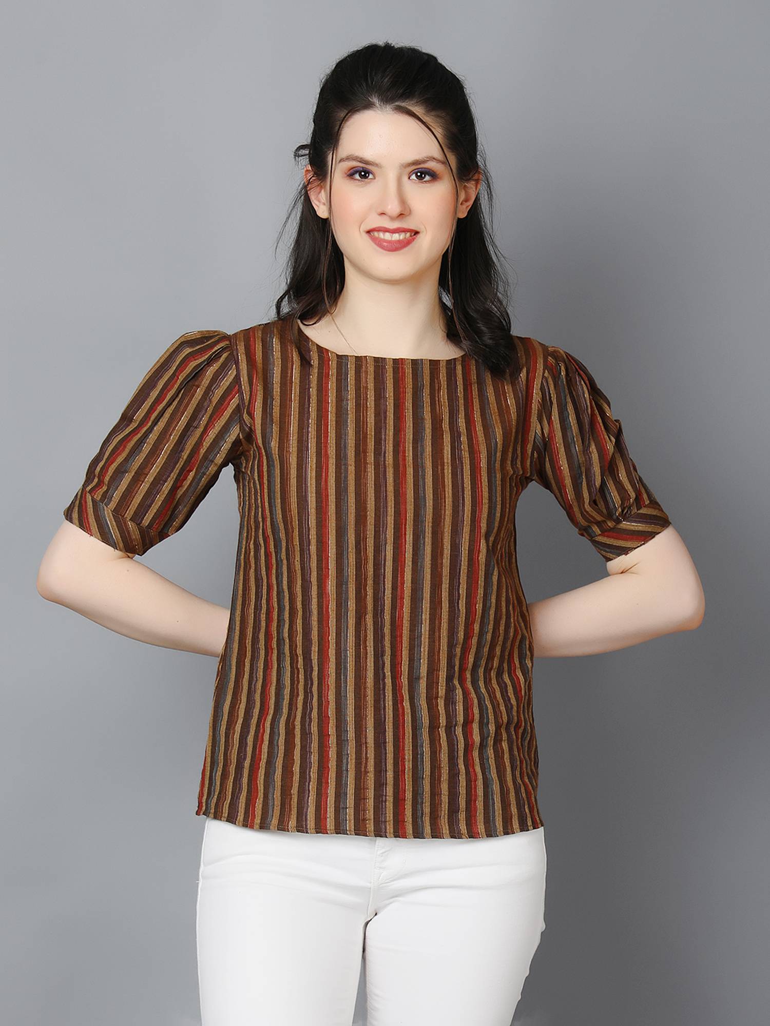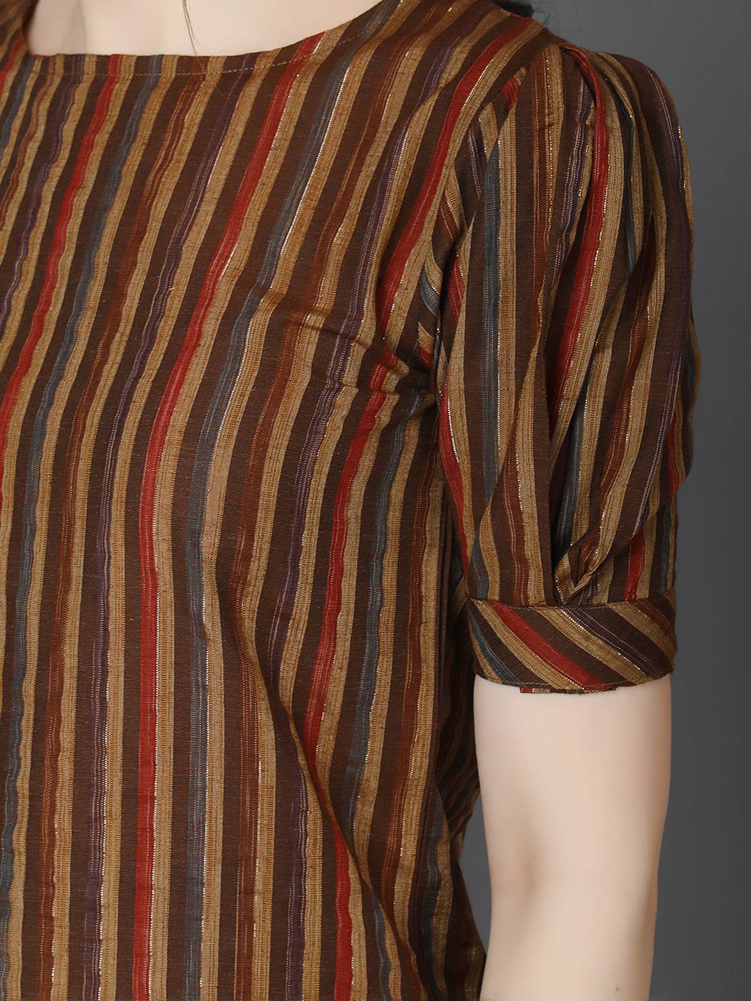Striped Cotton Cuffed Sleeve Top. (Brown)