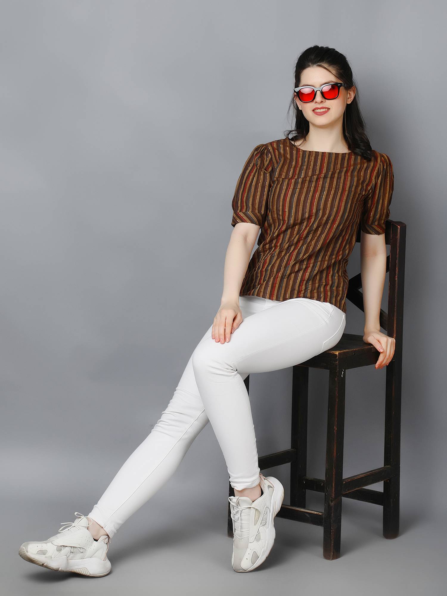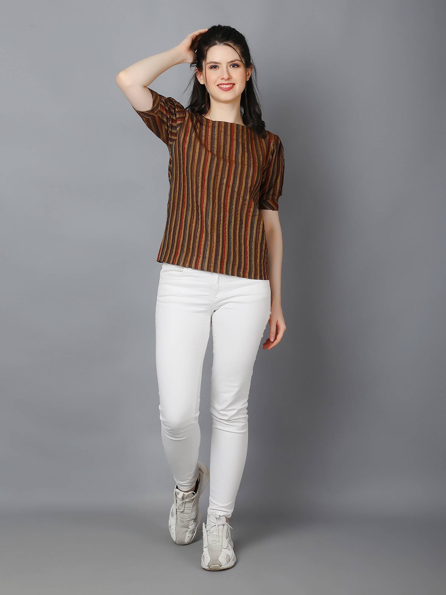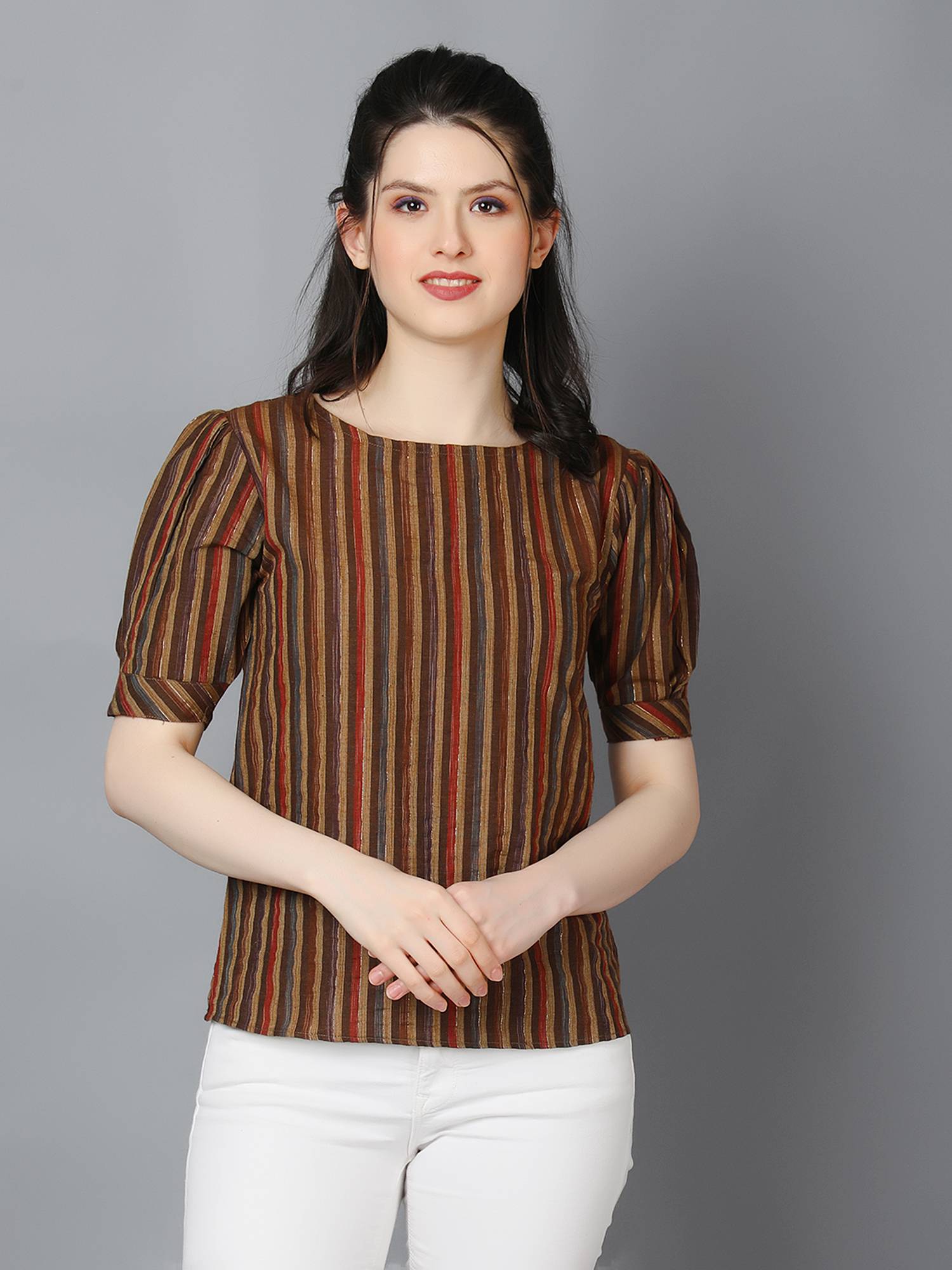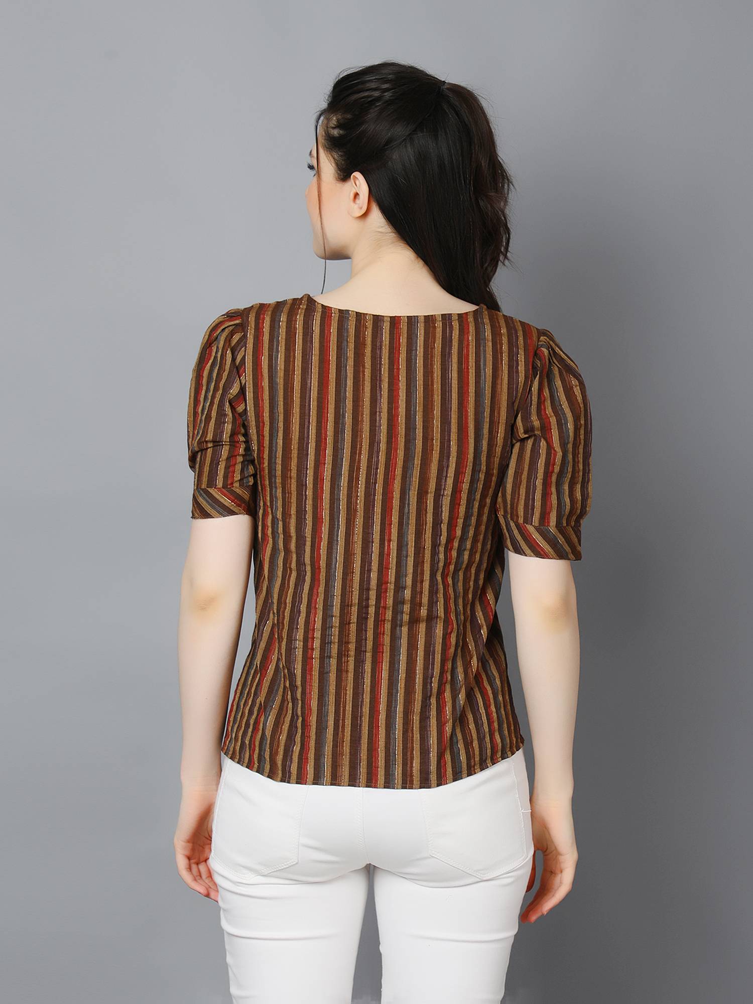 Striped Cotton Cuffed Sleeve Top. (Brown)