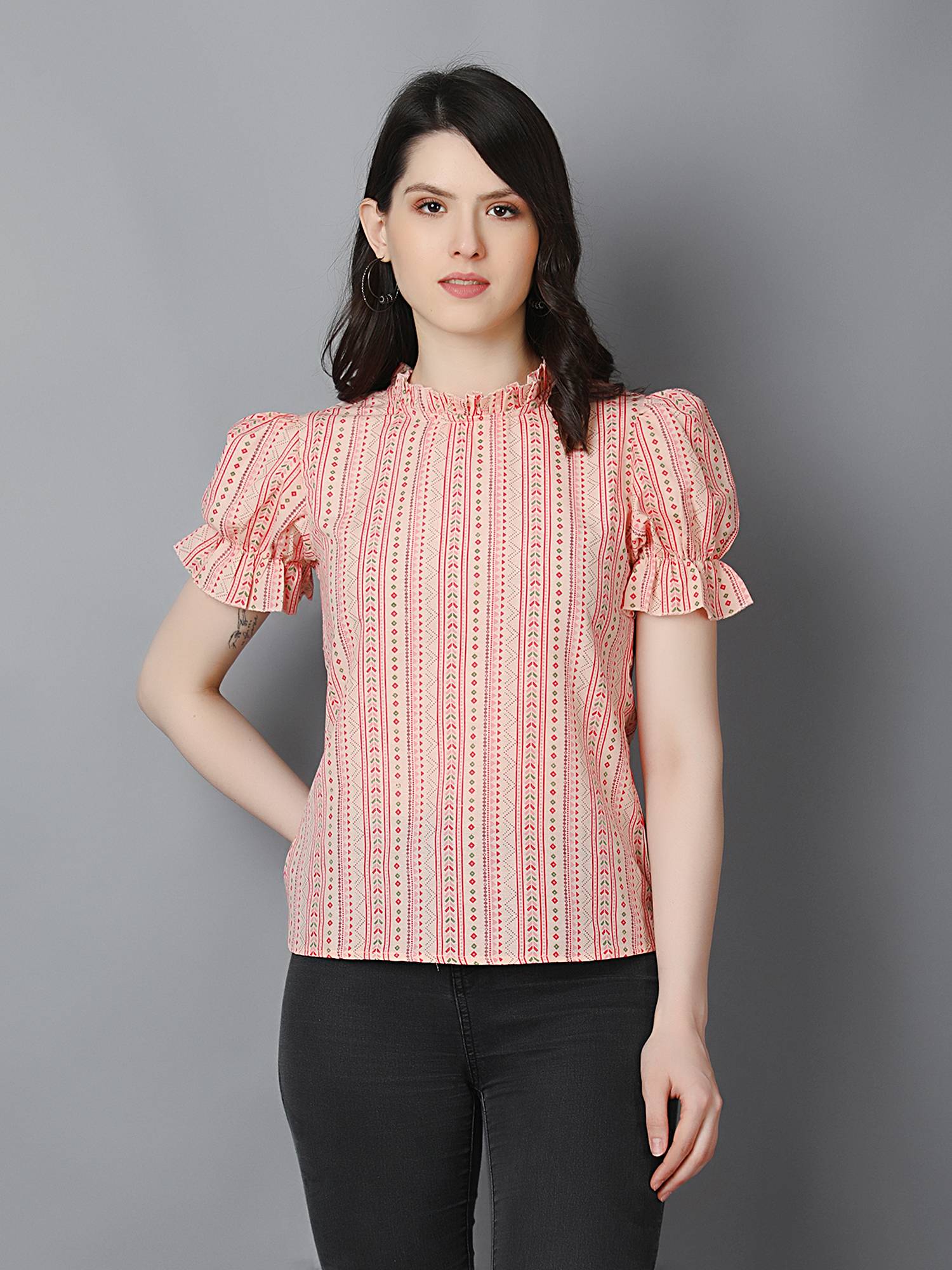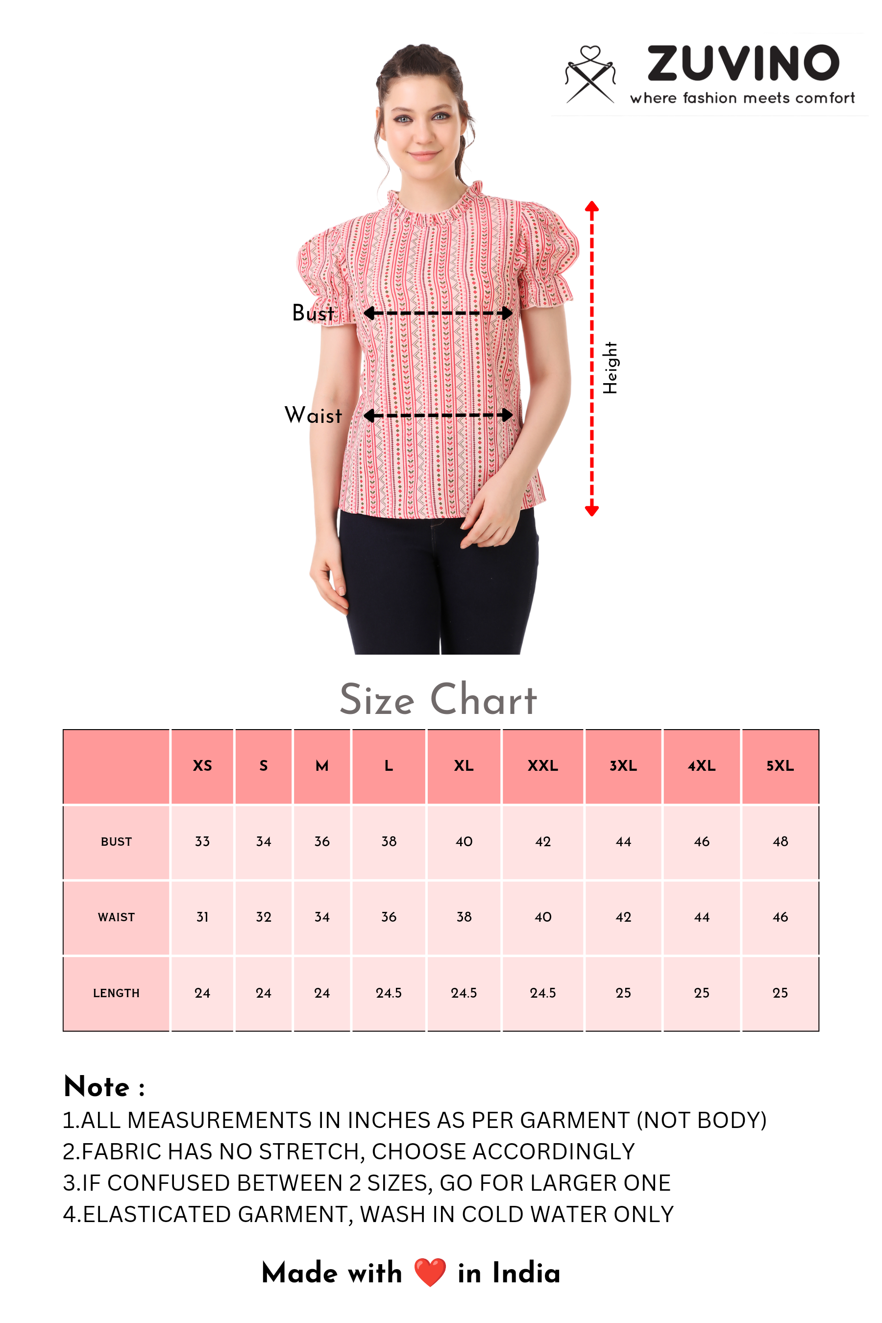 ZUVINO brings to you latest stylish western wear tops for women. This casual cotton top for women is best outfit for your new collection to summer tops for everyday use. Pair this balloon puff sleeves long top with skirt to use this as a formal top for office wear or party wear top for women. Floral print tops & Striped tops are also available for plus size women wear. This trendy top features high neck with puffed sleeves in latest designs. Regular length cute top has beautiful ruffled neckline & sleeves which are stitched with perfection to provide best fitting for all body types. Pair this trendy top for jeans to get basic stylish casual college look. Basic top is best addition to your ethnic tops if you try this with flared skirt or bell bottom pants. Back keyhole with button closure is given in this cotton rayon top for all day comfort and easy wearing. Very soft and breathable fabric ensures that you get only the best value for money. Available in multiple colors and print options, this deal is not to be missed. Grab your choice from pink, grey, peach, lemon, yellow, white, black and much more.