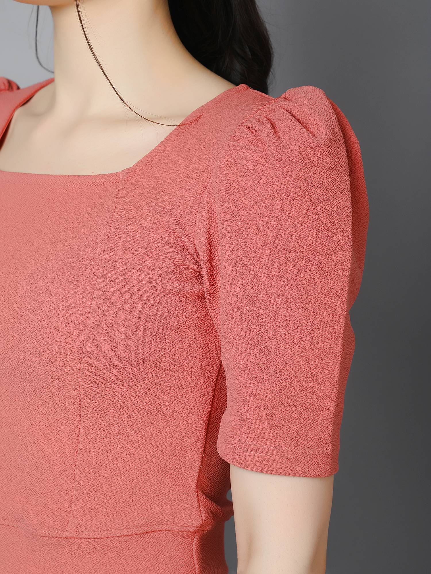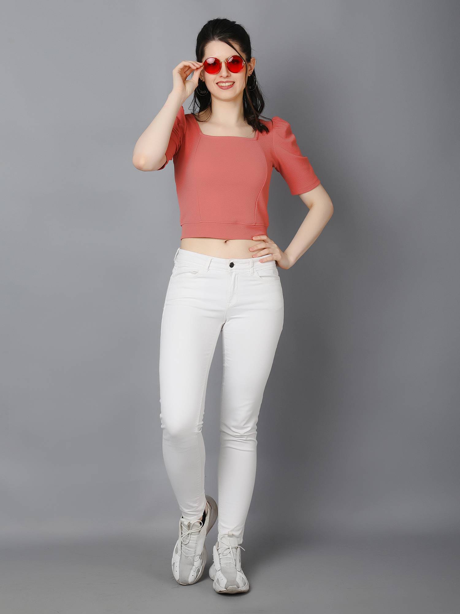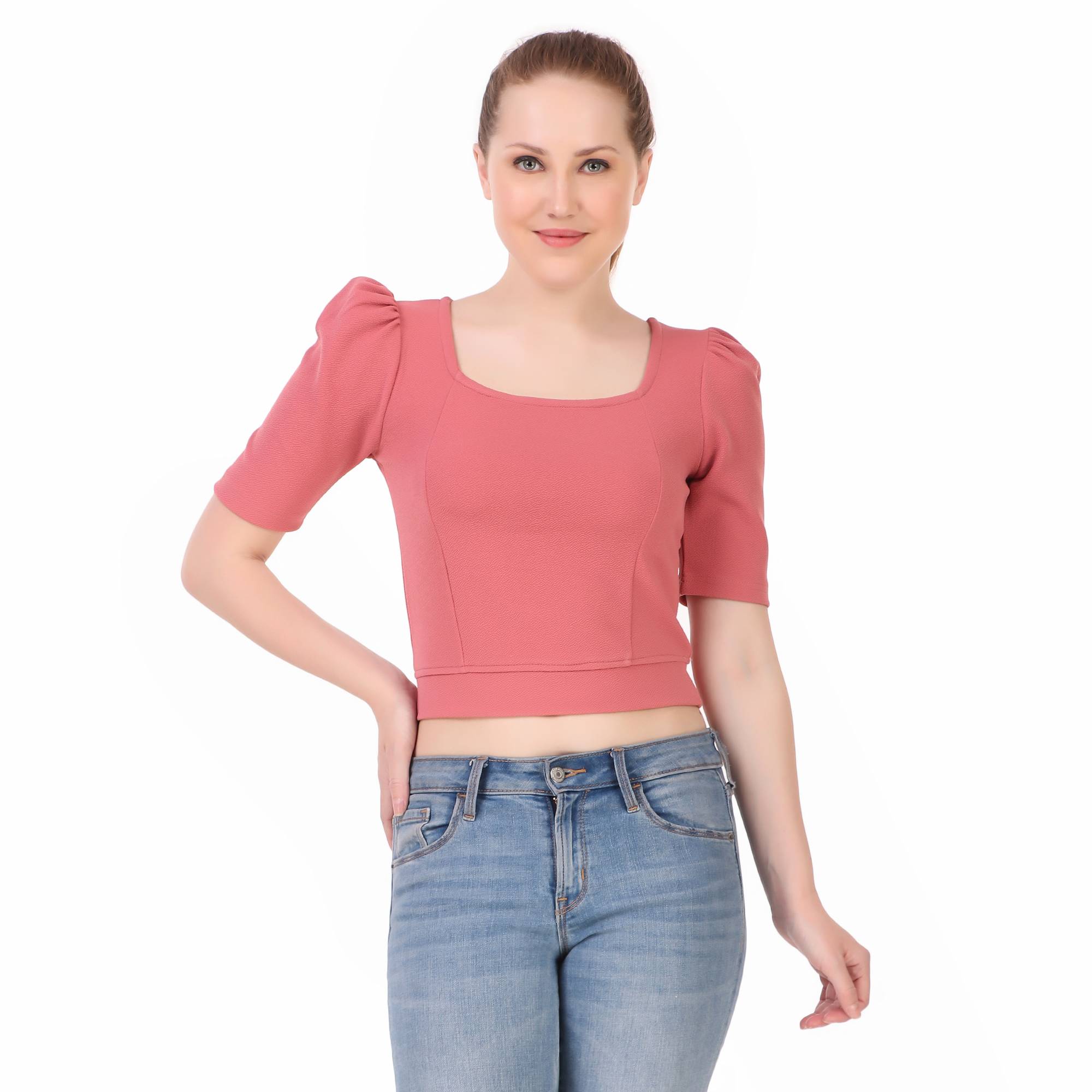 Stylish Casual Crop Top With Puffed Sleeves (Pink)